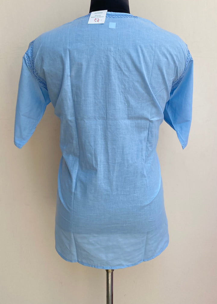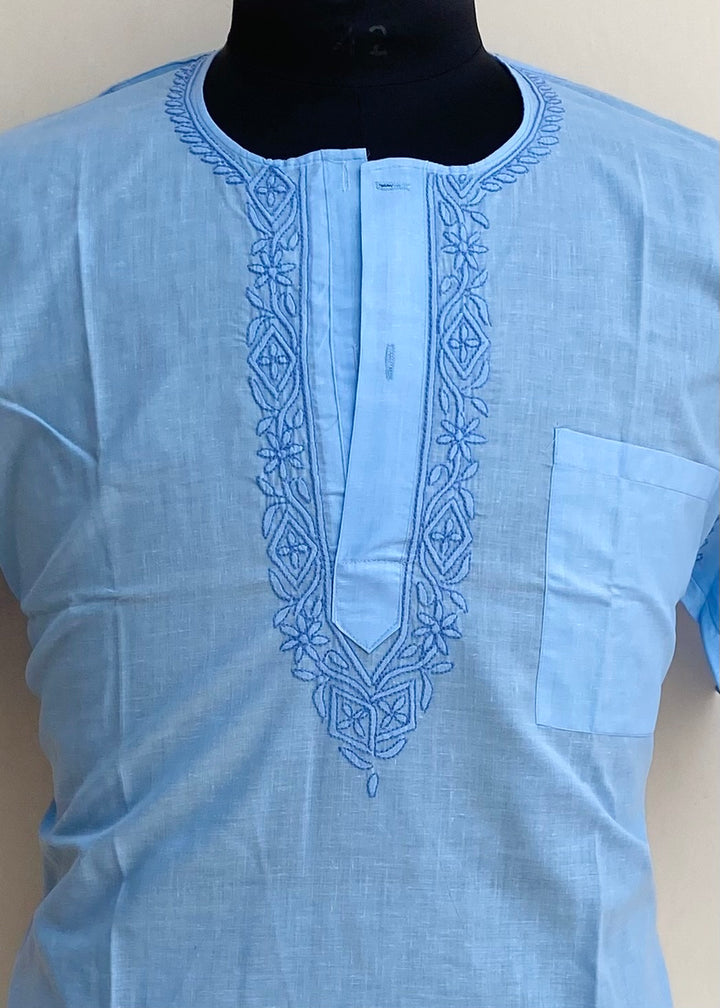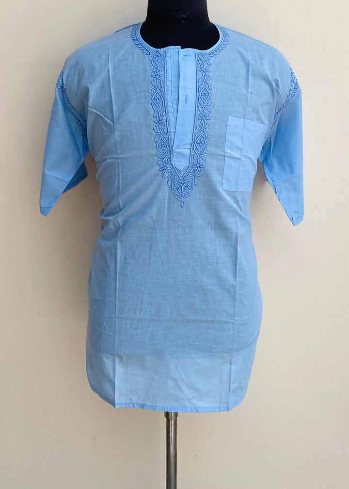Lucknowi Chikankari Men’s Half Sleeves Short Kurta Blue Cotton With Pocket
