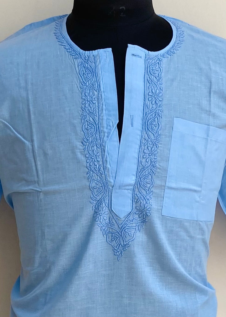 Lucknowi Chikankari Men’s Half Sleeves Short Kurta Blue Cotton With Pocket