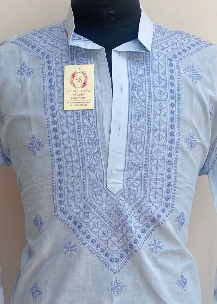 Lucknowi Chikankari Men’s Kurta Blue Cotton