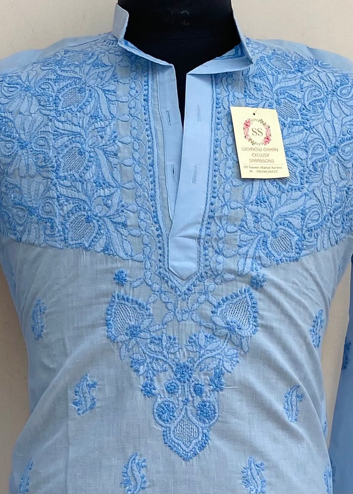 Lucknowi Chikankari Men’s kurta Blue Cotton With Jaali Work
