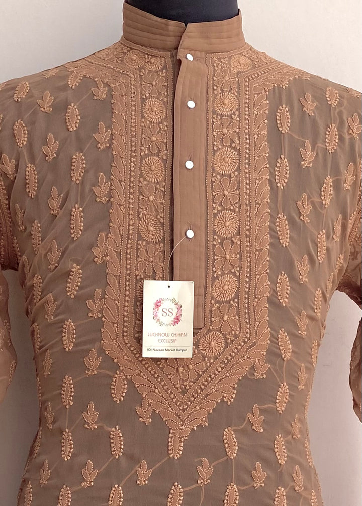 Lucknowi Chikankari Men’s Kurta Brown Georgette