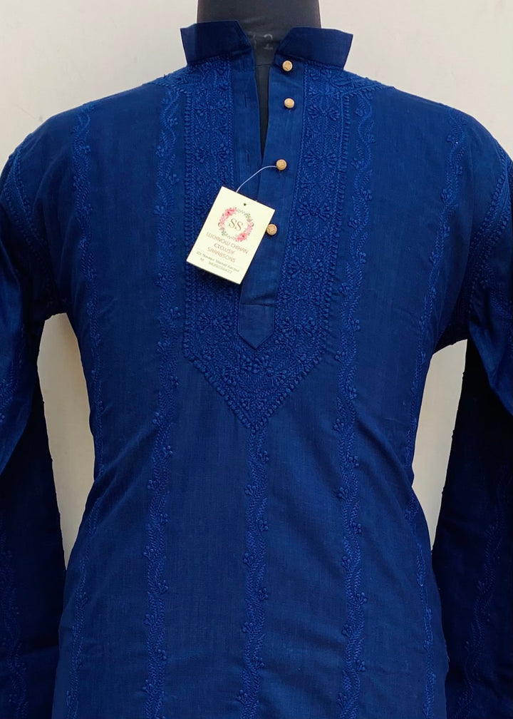 Lucknowi Chikankari Men’s Kurta Navy Blue Cotton