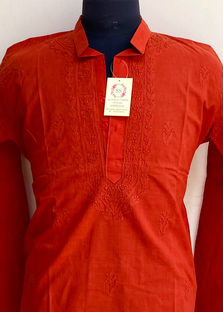 Lucknowi Chikankari Men’s Kurta Rust Cotton With Jaali Work