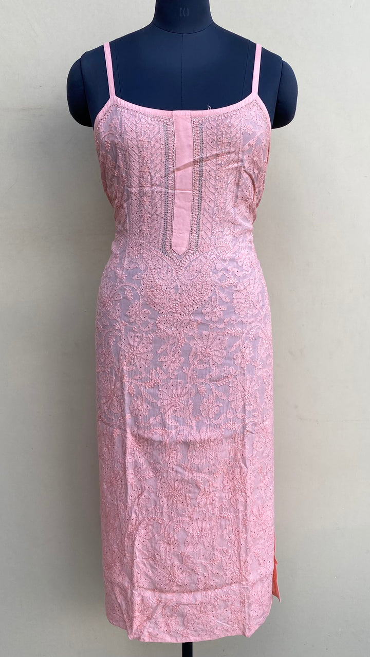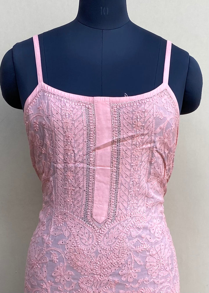 Lucknowi Chikankari Ombre Noodle Strip Kurti Peach Muslin Cotton With Mukaish & Resham Work