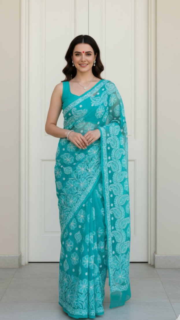 Lucknowi Chikankari Saree Blue Georgette With Blouse