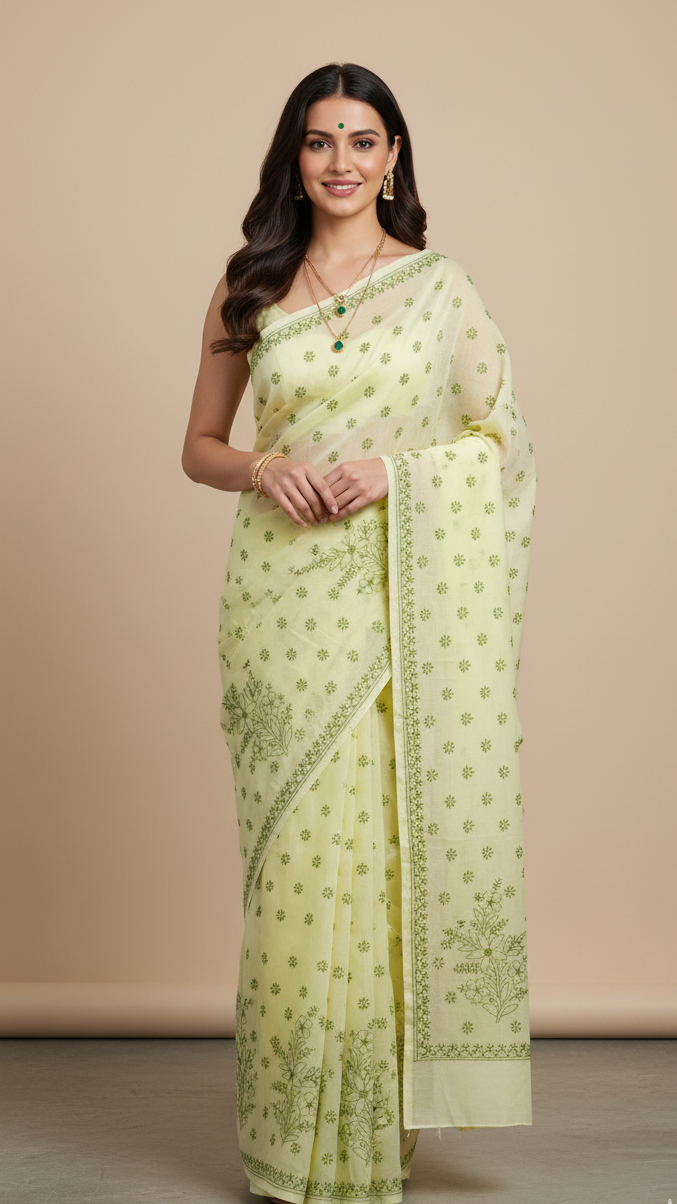 Lucknowi Chikankari Saree Lemon Yellow Cotton