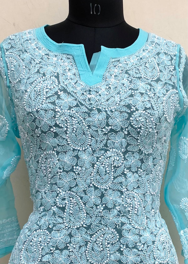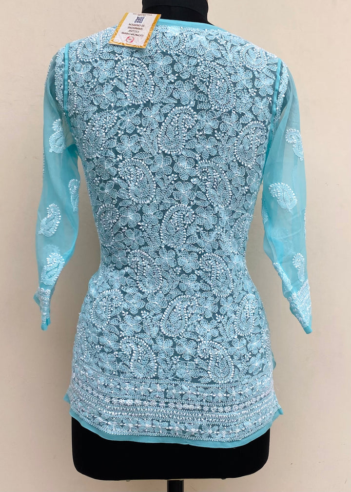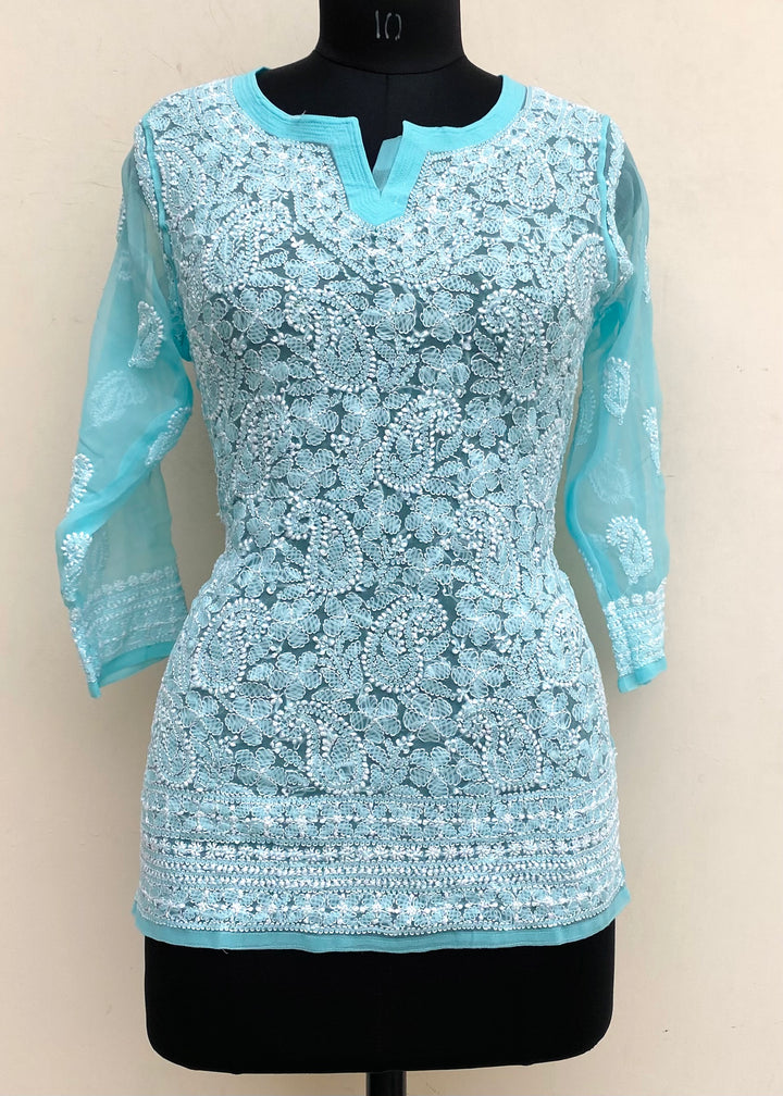 Lucknowi Chikankari Short Kurti Blue Georgette