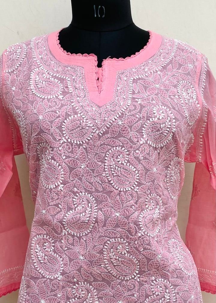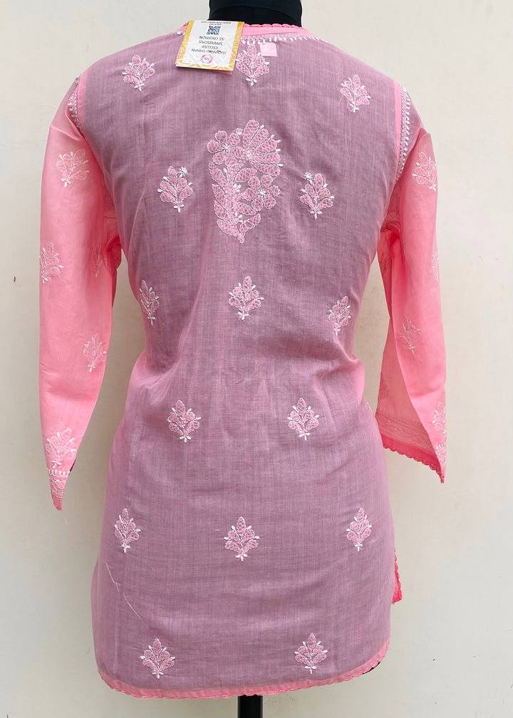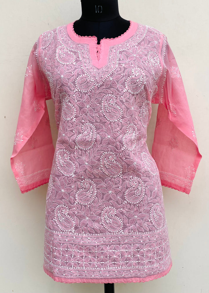 Lucknowi Chikankari Short Kurti Pink Cotton