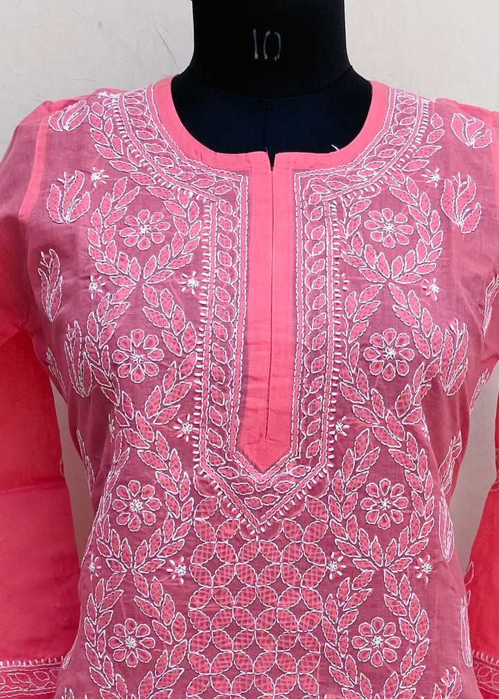 Lucknowi Chikankari Short Kurti Pink Cotton