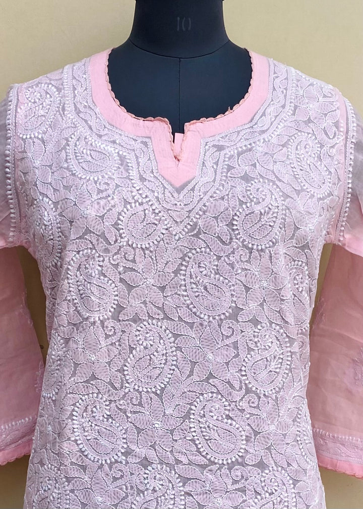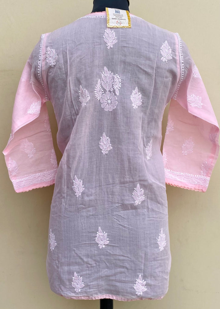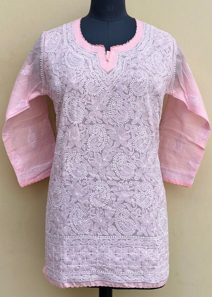 Lucknowi Chikankari Short Kurti Pink Cotton