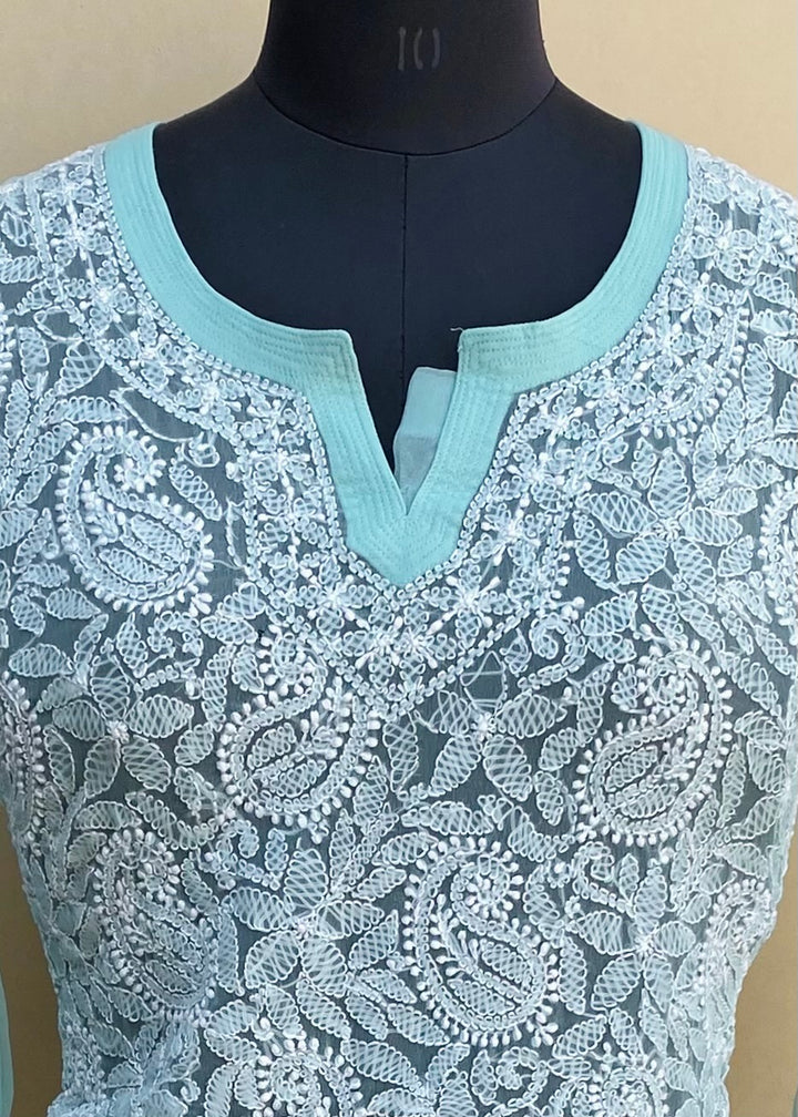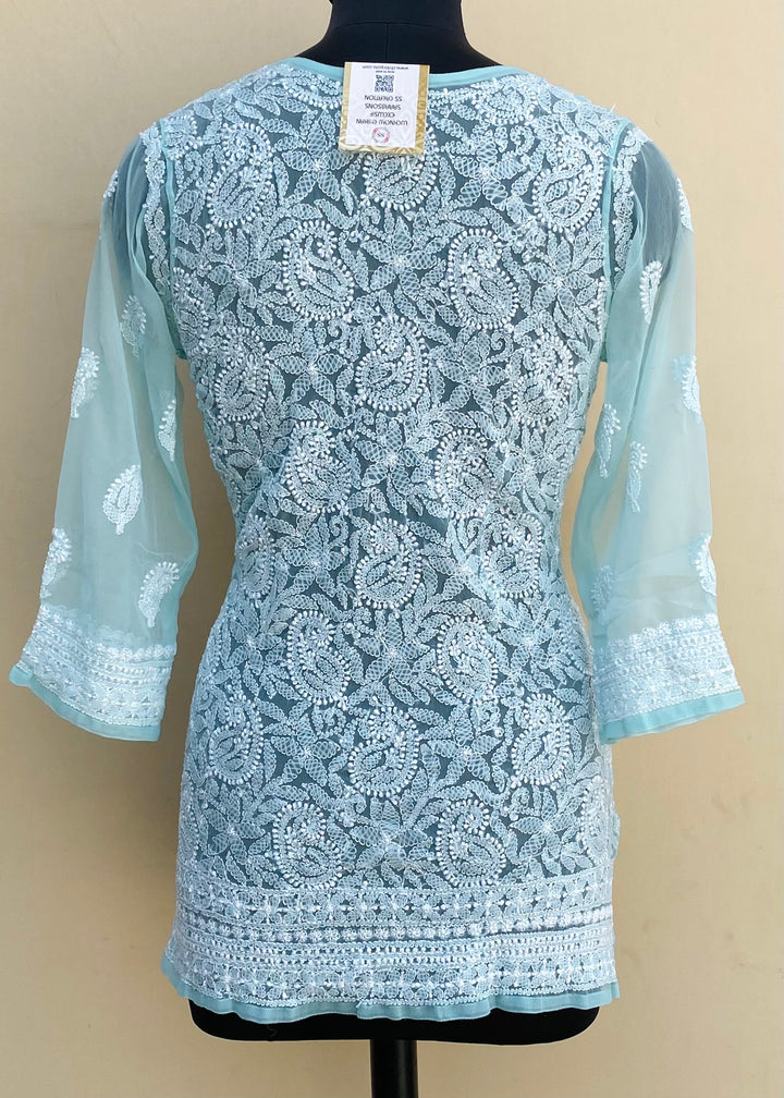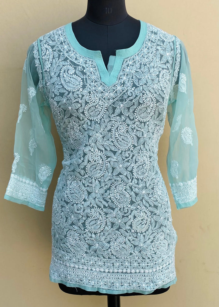 Lucknowi Chikankari Short Kurti Sea Green Georgette