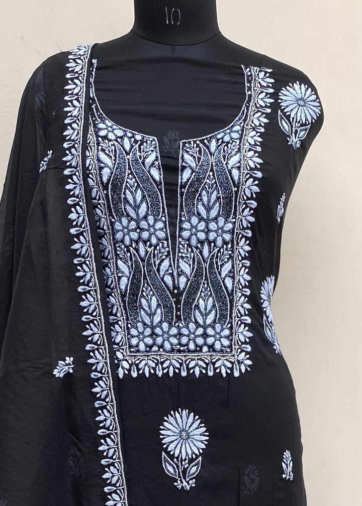 Lucknowi Chikankari Suit Length 2 Piece Black Mal Chanderi With Sequence ,Pearl & Cutdana Work With Embroidered Mal Chanderi Dupatta
