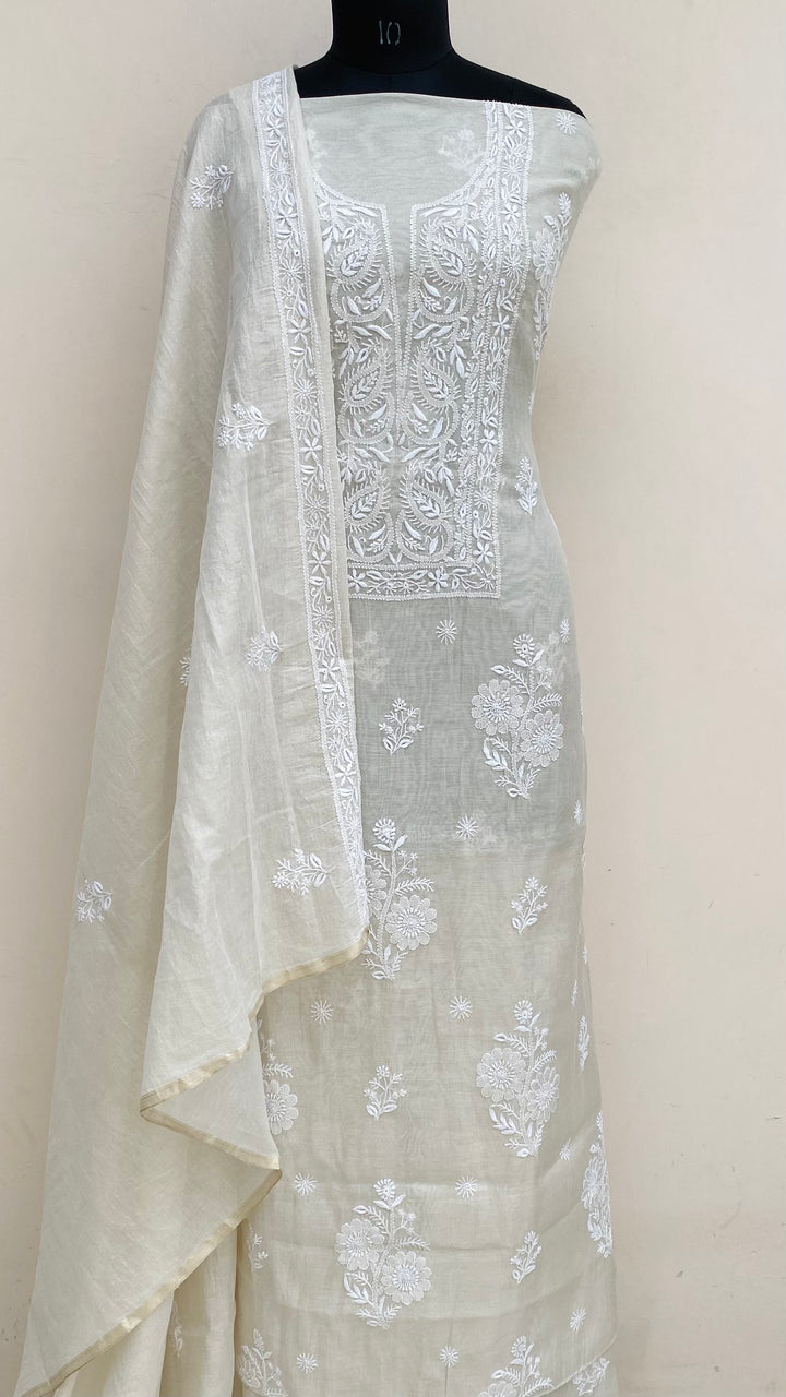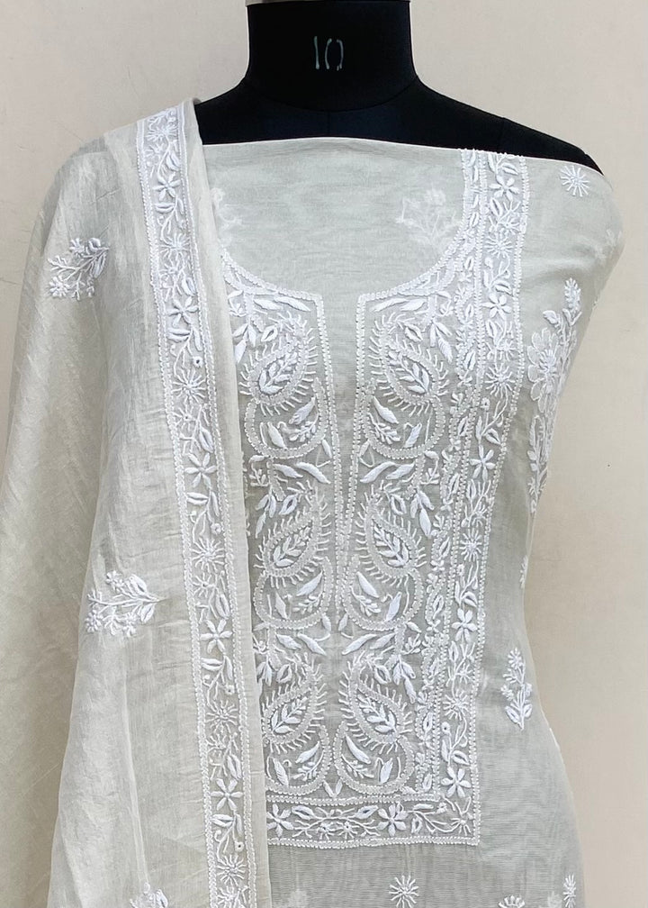 Lucknowi Chikankari Suit Length 2 Piece Cream Tissue With Embroidered Tissue Dupatta