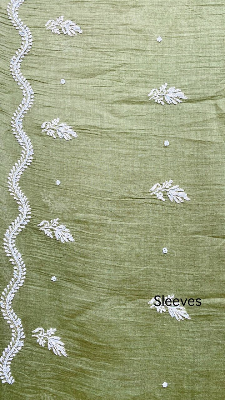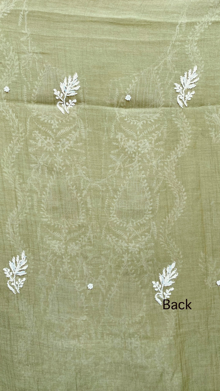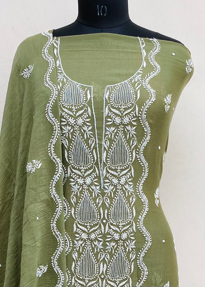 Lucknowi Chikankari Suit Length 2 Piece Green Mal Chanderi With Cutdana & Pearl Work With Embroidered Mal Chanderi Dupatta