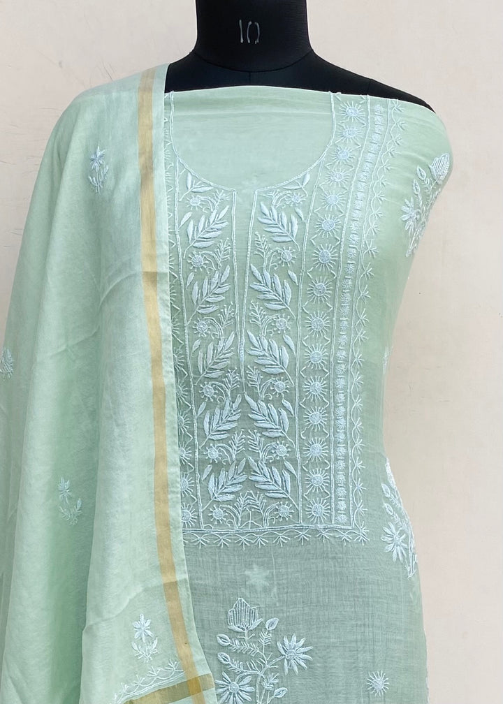 Lucknowi Chikankari Suit Length 2 Piece Green Mal Chanderi With Cutdana Work With Embroidered Mal Chanderi Dupatta