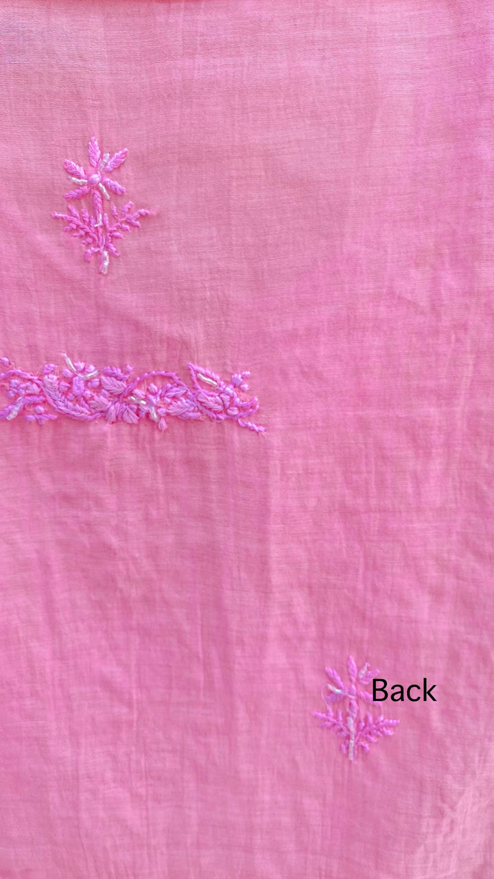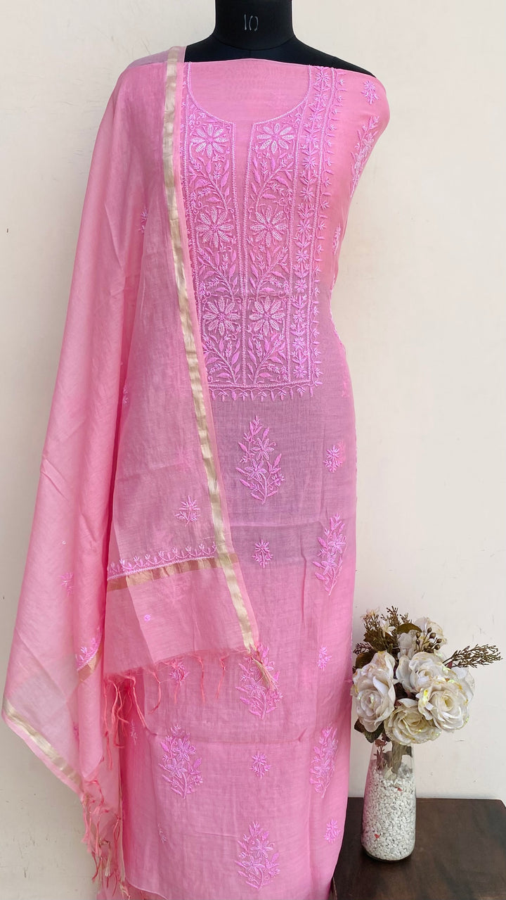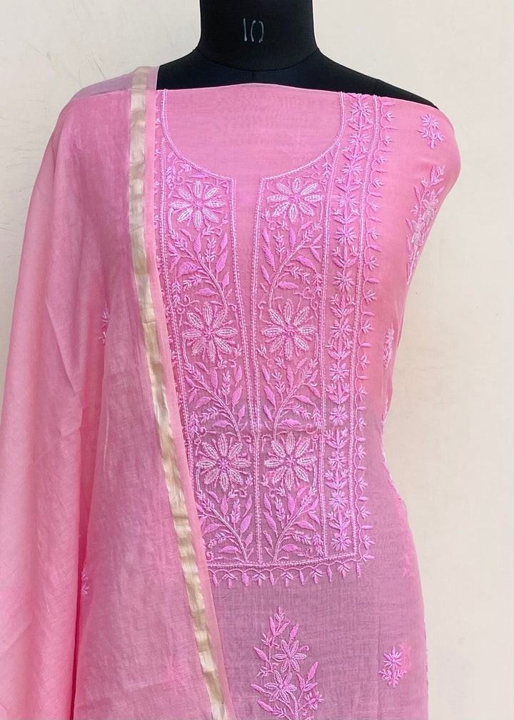 Lucknowi Chikankari Suit Length 2 Piece Pink Mal Chanderi With Cutdana Work With Embroidered Mal Chanderi Dupatta