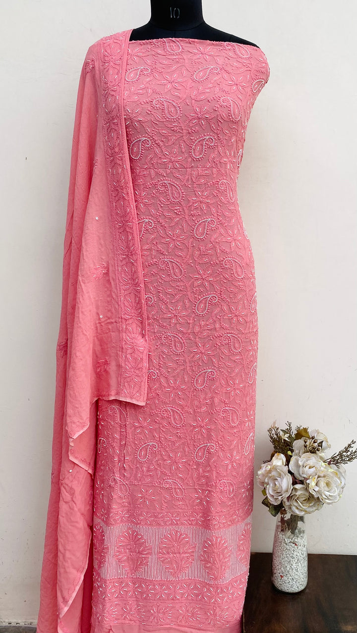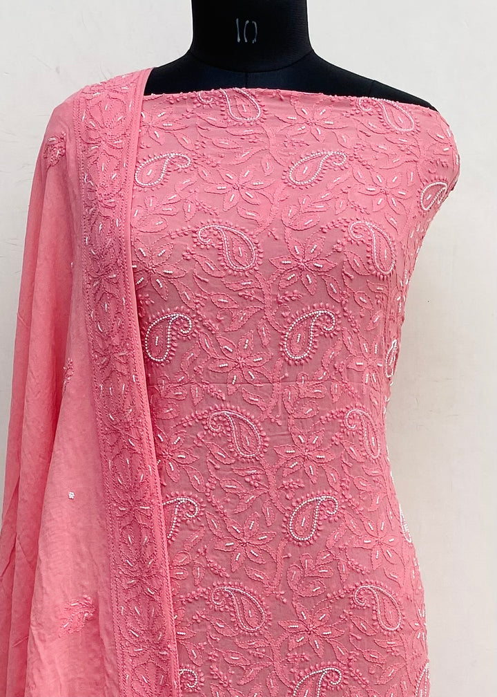 Lucknowi Chikankari Suit Length 2 Piece Pink Pure Georgette With Pearl & Cutdana Work With Embroidered Pure Georgette Dupatta