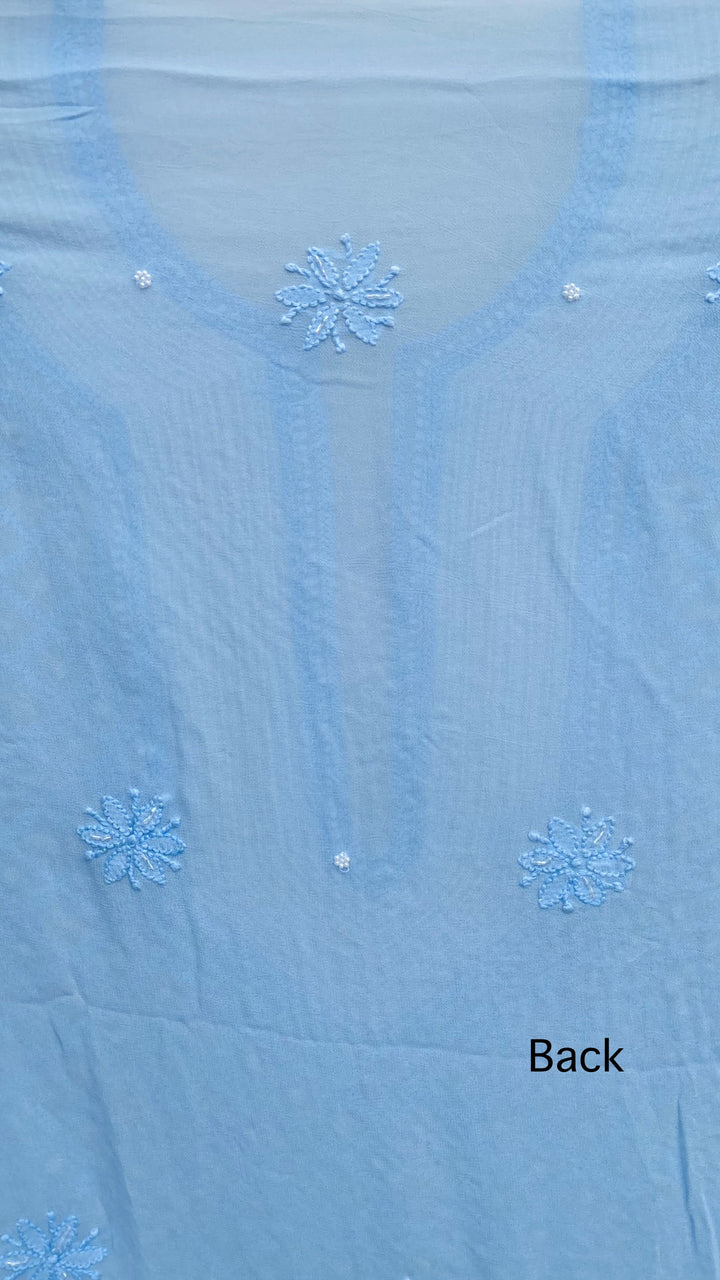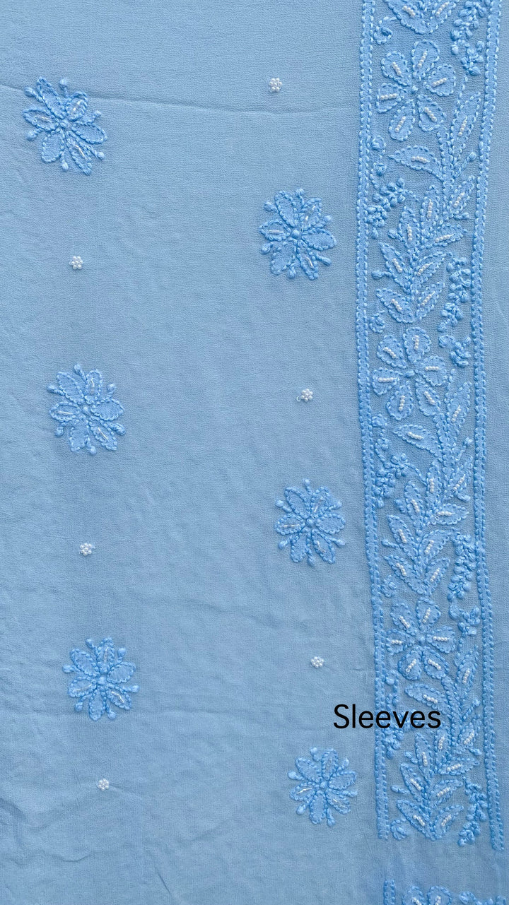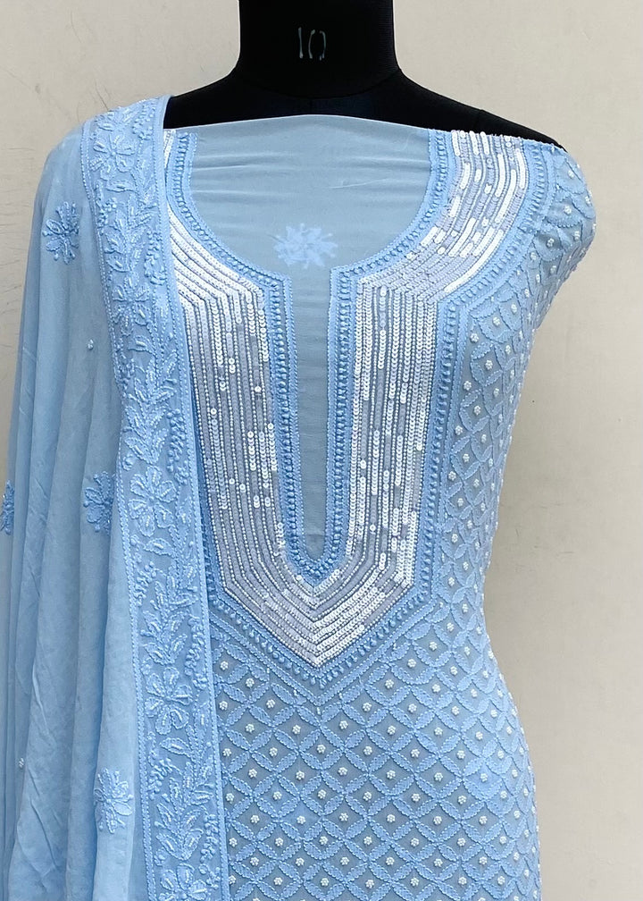 Lucknowi Chikankari Suit Length 2 Piece Powder Blue Pure Georgette With Pearl & Sequence Work With Embroidered Pure Georgette Dupatta
