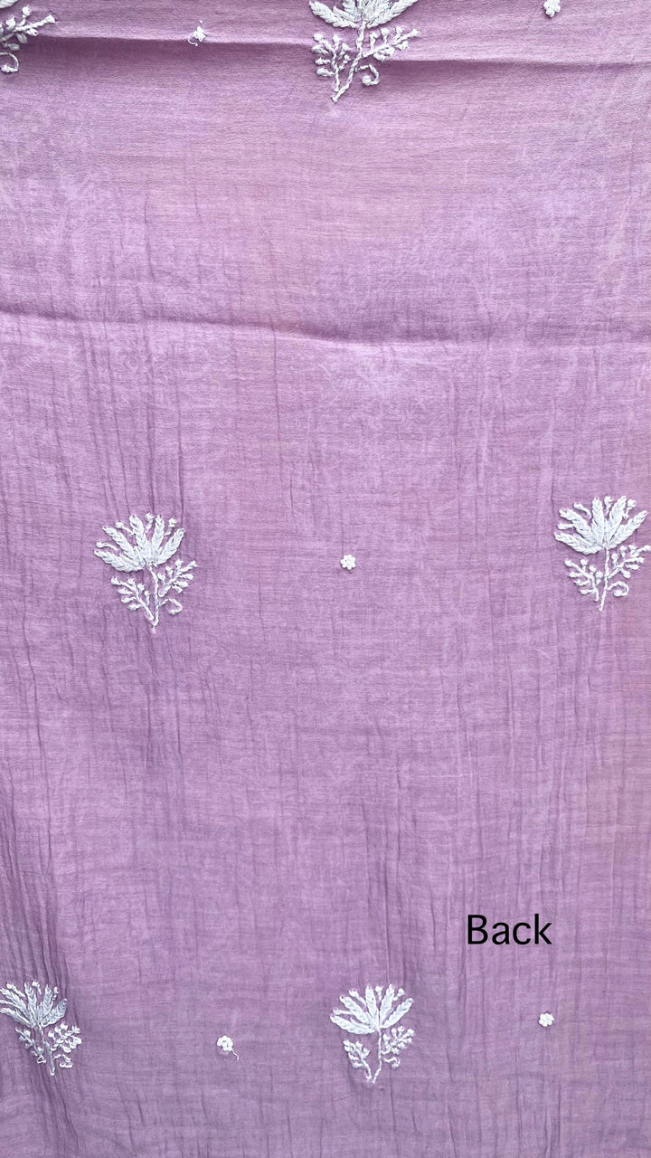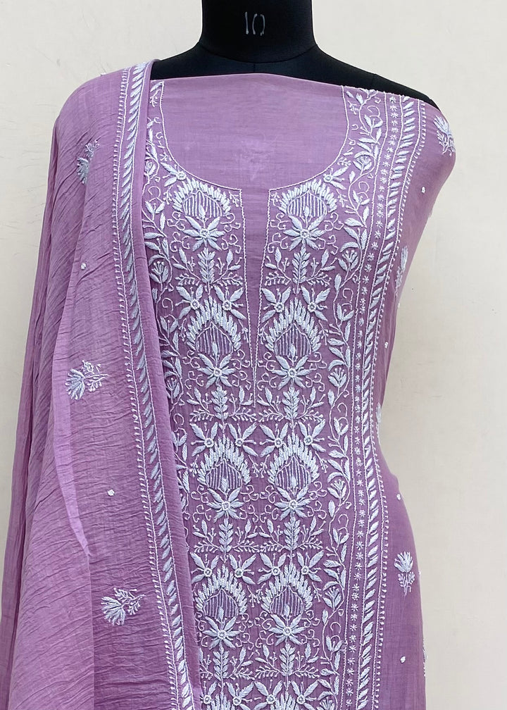 Lucknowi Chikankari Suit Length 2 Piece Purple Mal Chanderi With Pearl & Cutdana Work With Embroidered Mal Chanderi Dupatta