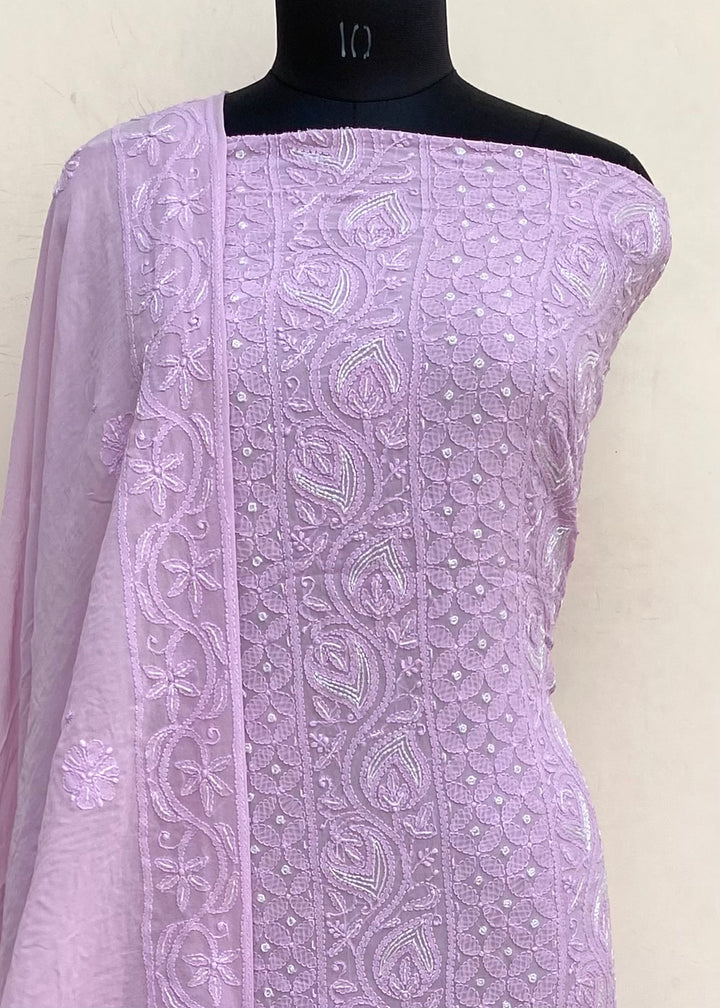 Lucknowi Chikankari Suit Length 2 Piece Purple Pure Georgette With Cutdana Work With Embroidered Pure Georgette Dupatta