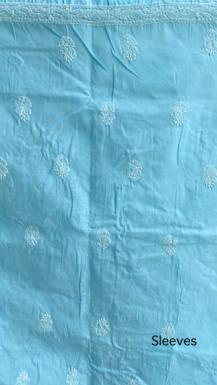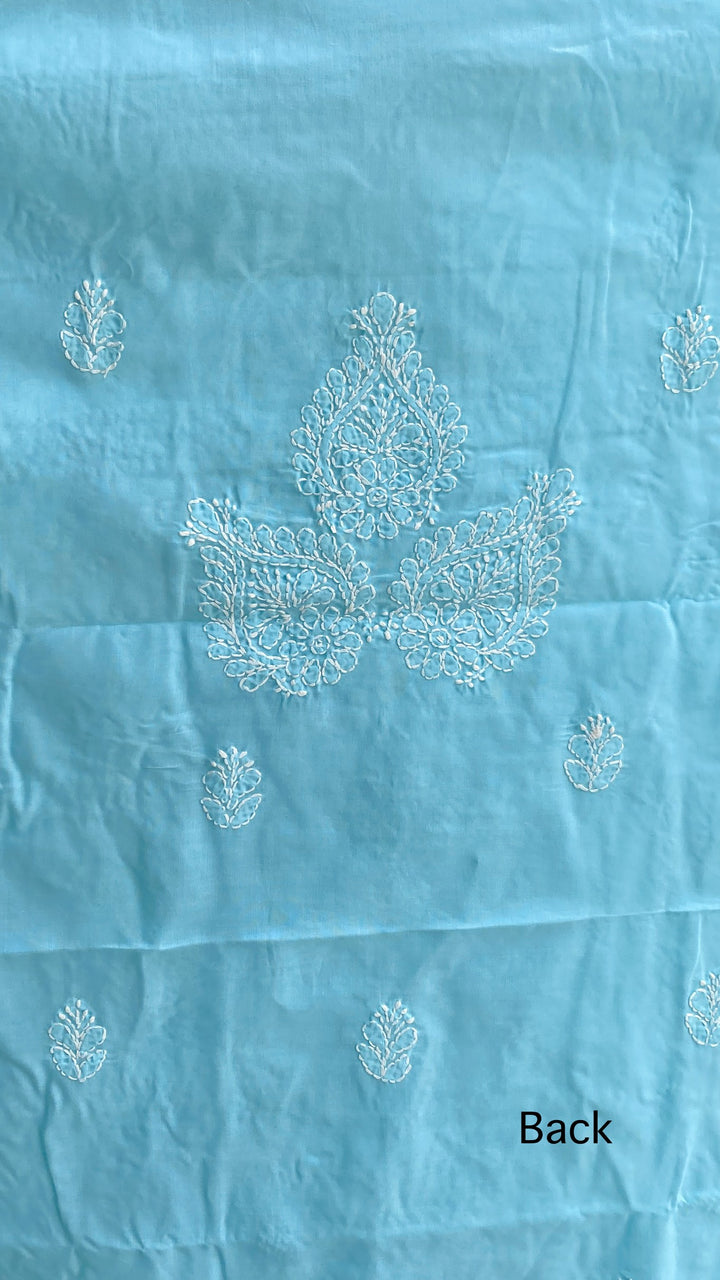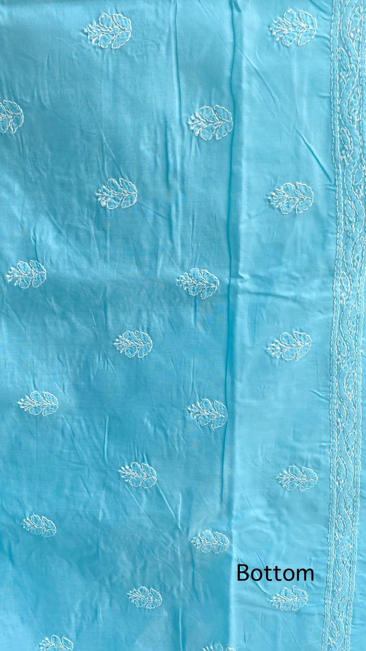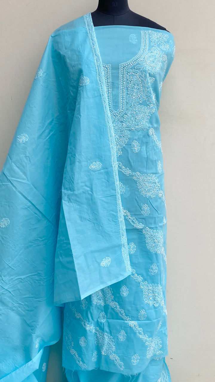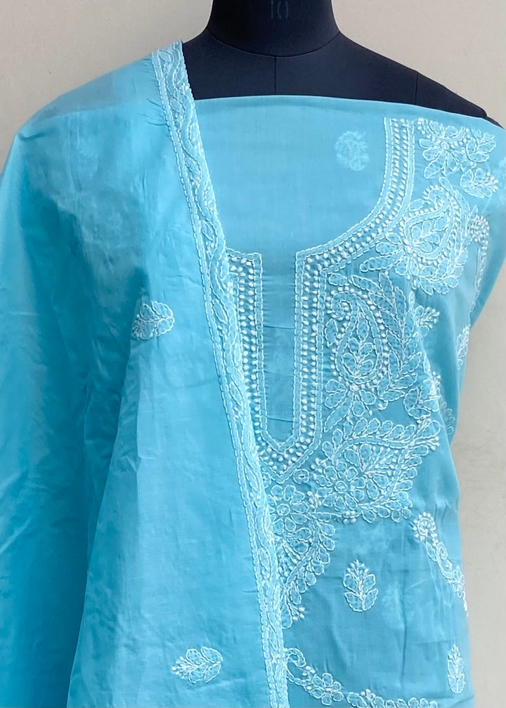 Lucknowi Chikankari Suit Length 3 Piece Blue Cotton With Embroidered Cotton Dupatta & Embroidered Same Colour Cotton Bottom