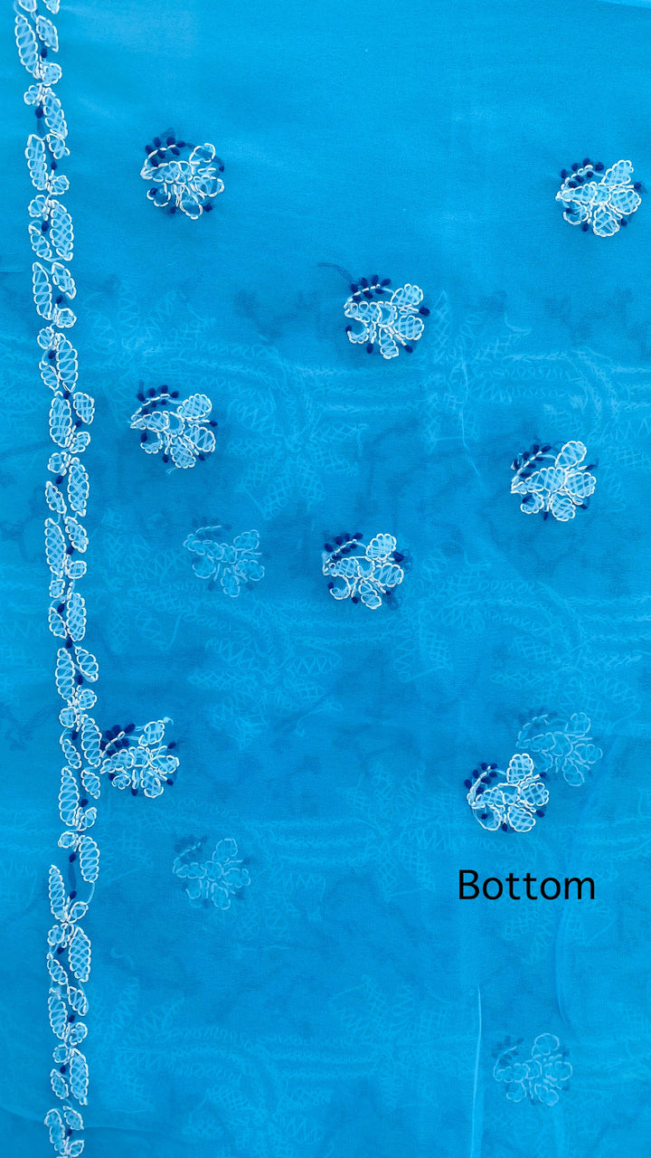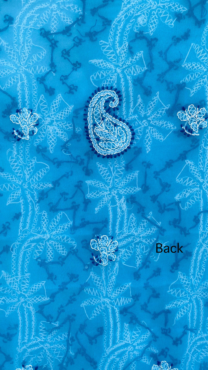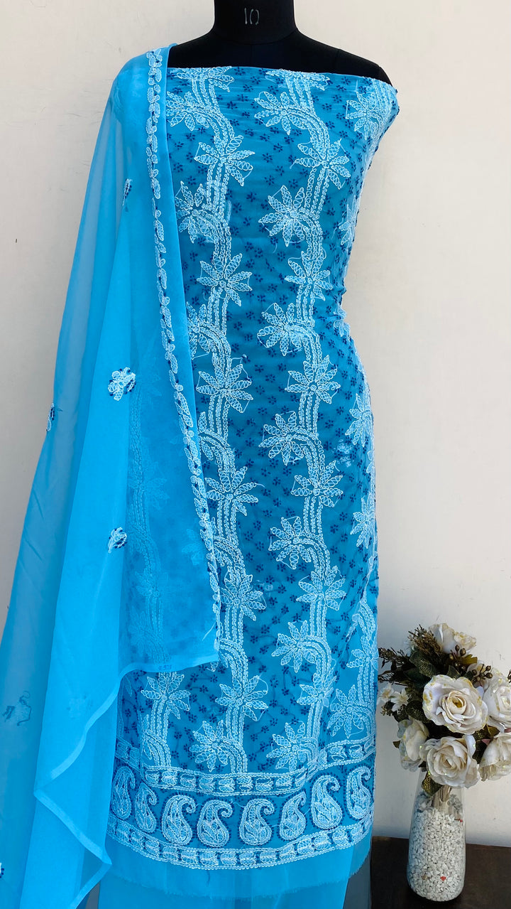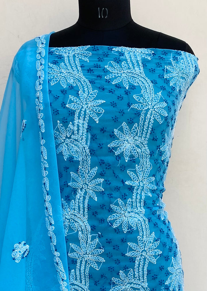 Lucknowi Chikankari Suit Length 3 Piece Blue Georgette With Embroidered Georgette Dupatta & Embroidered Same Colour Georgette Bottom