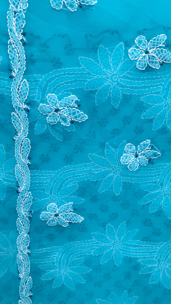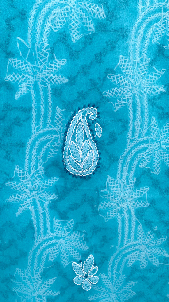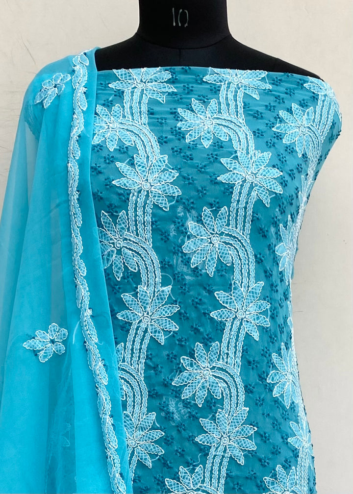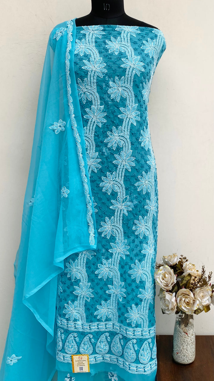Lucknowi Chikankari Suit Length 3 Piece Blue Georgette With Embroidered Georgette Dupatta & Embroidered Same Colour Georgette Bottom