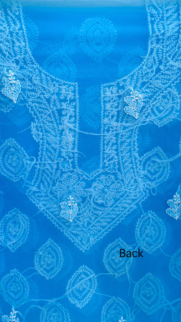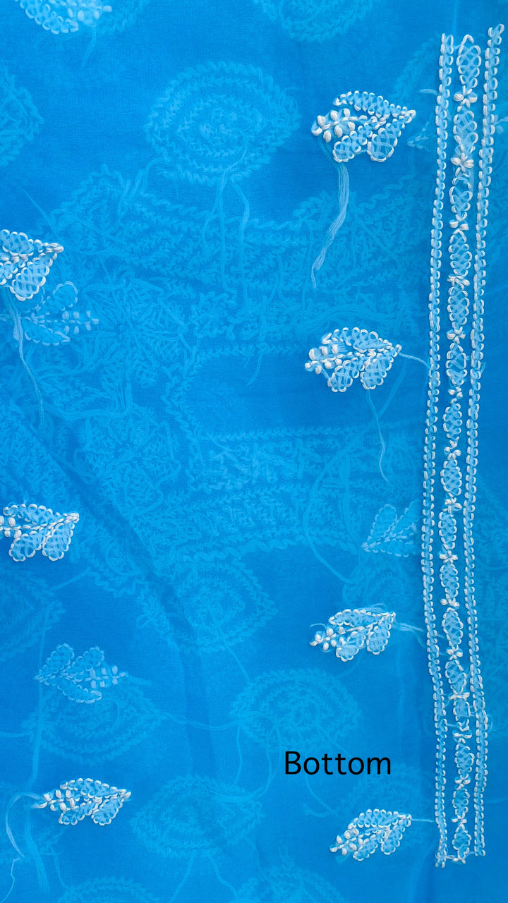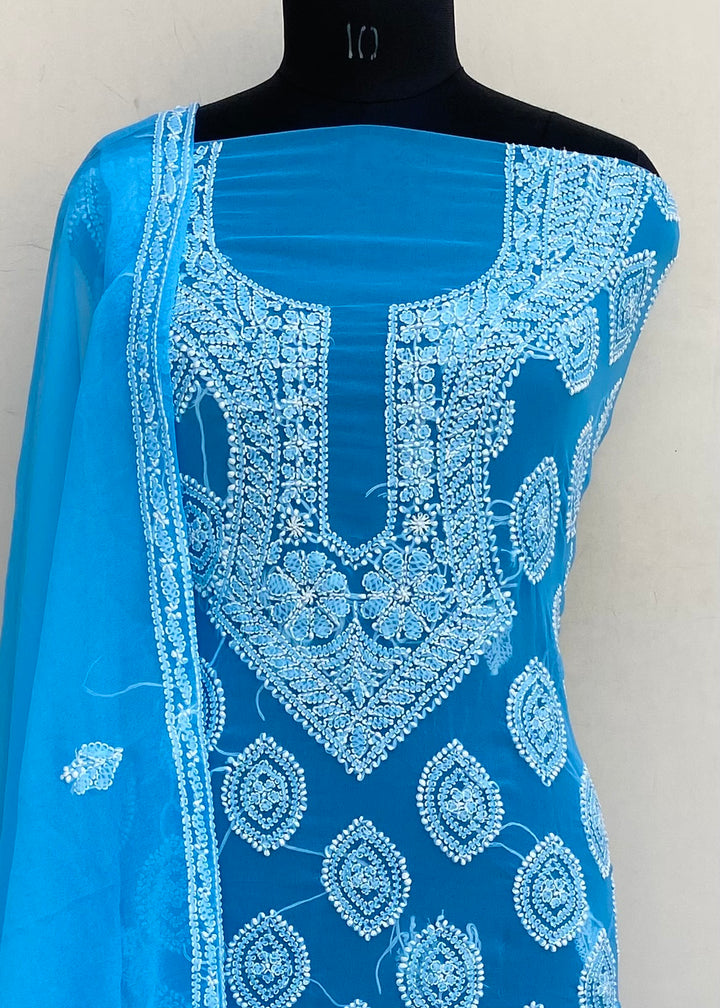 Lucknowi Chikankari Suit Length 3 Piece Blue Georgette With Embroidered Georgette Dupatta & Embroidered Same Colour Georgette Bottom