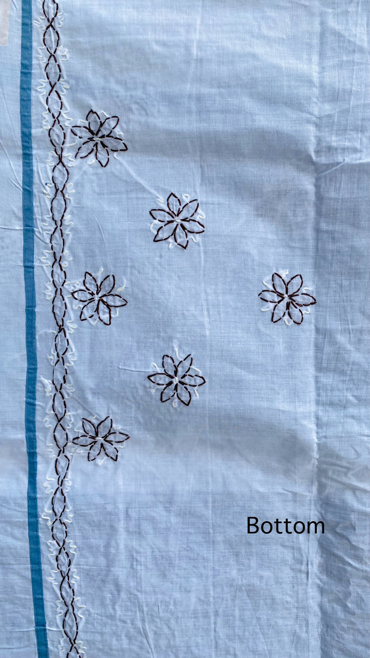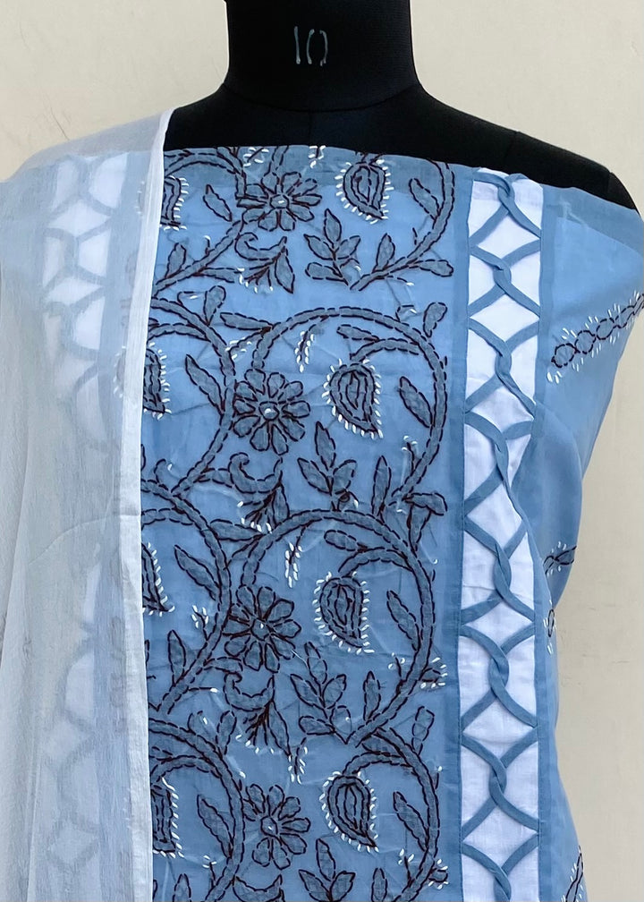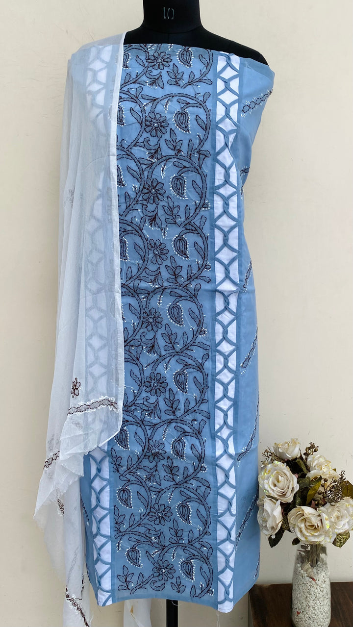 Lucknowi Chikankari Suit Length 3 Piece Gray Cotton With Embroidered Chiffon Dupatta & Embroidered White Colour Cotton Bottom