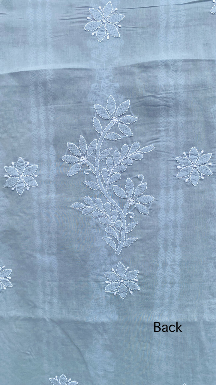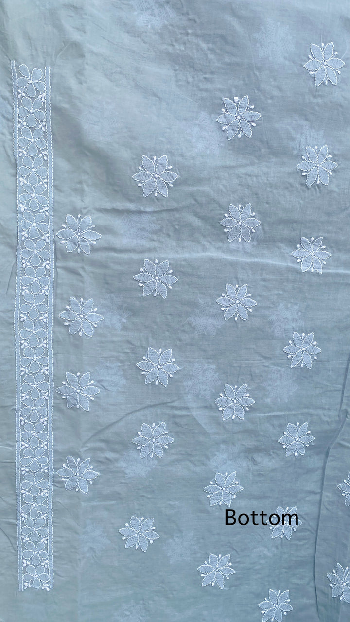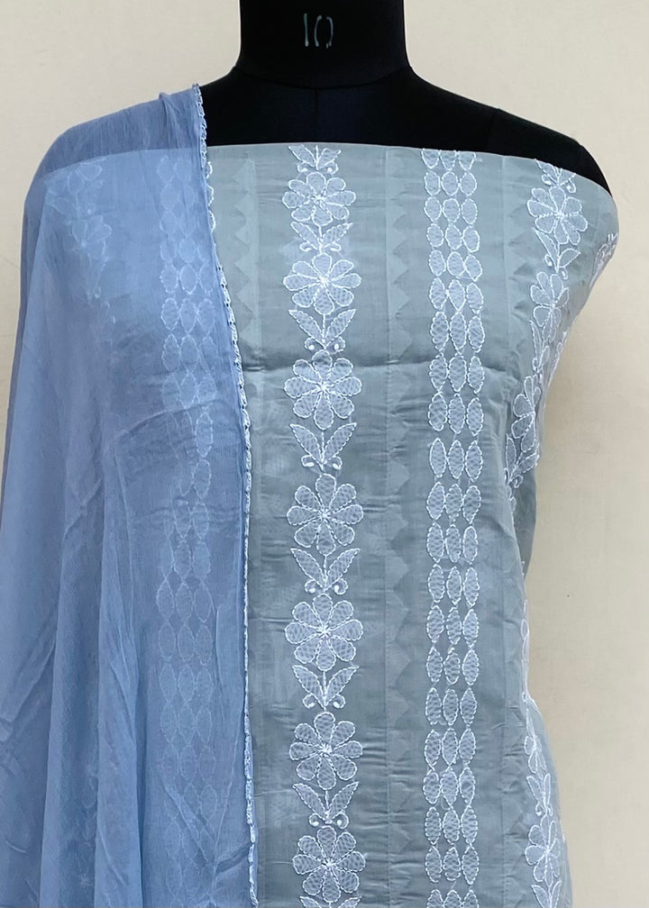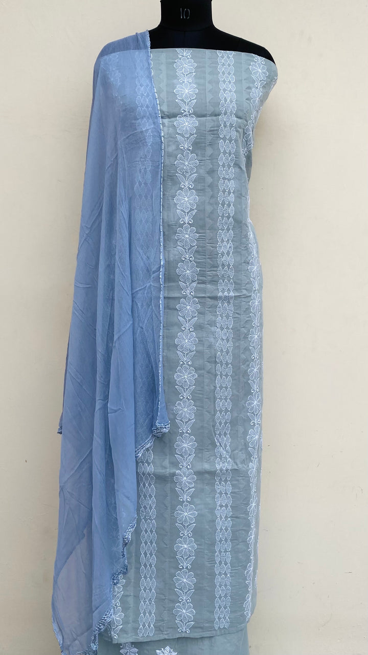 Lucknowi Chikankari Suit Length 3 Piece Gray Cotton With Applique Work With Pure Chiffon Dupatta & Embroidered Same Colour Cotton Bottom