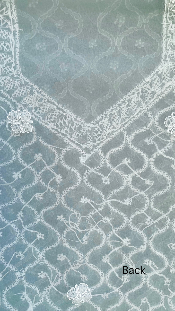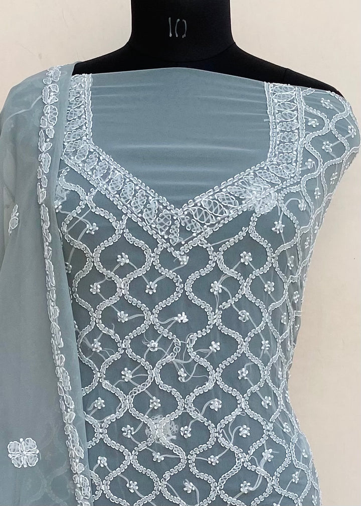 Lucknowi Chikankari Suit Length 3 Piece Gray Georgette With Embroidered Georgette Dupatta & Embroidered Same Colour Georgette Bottom