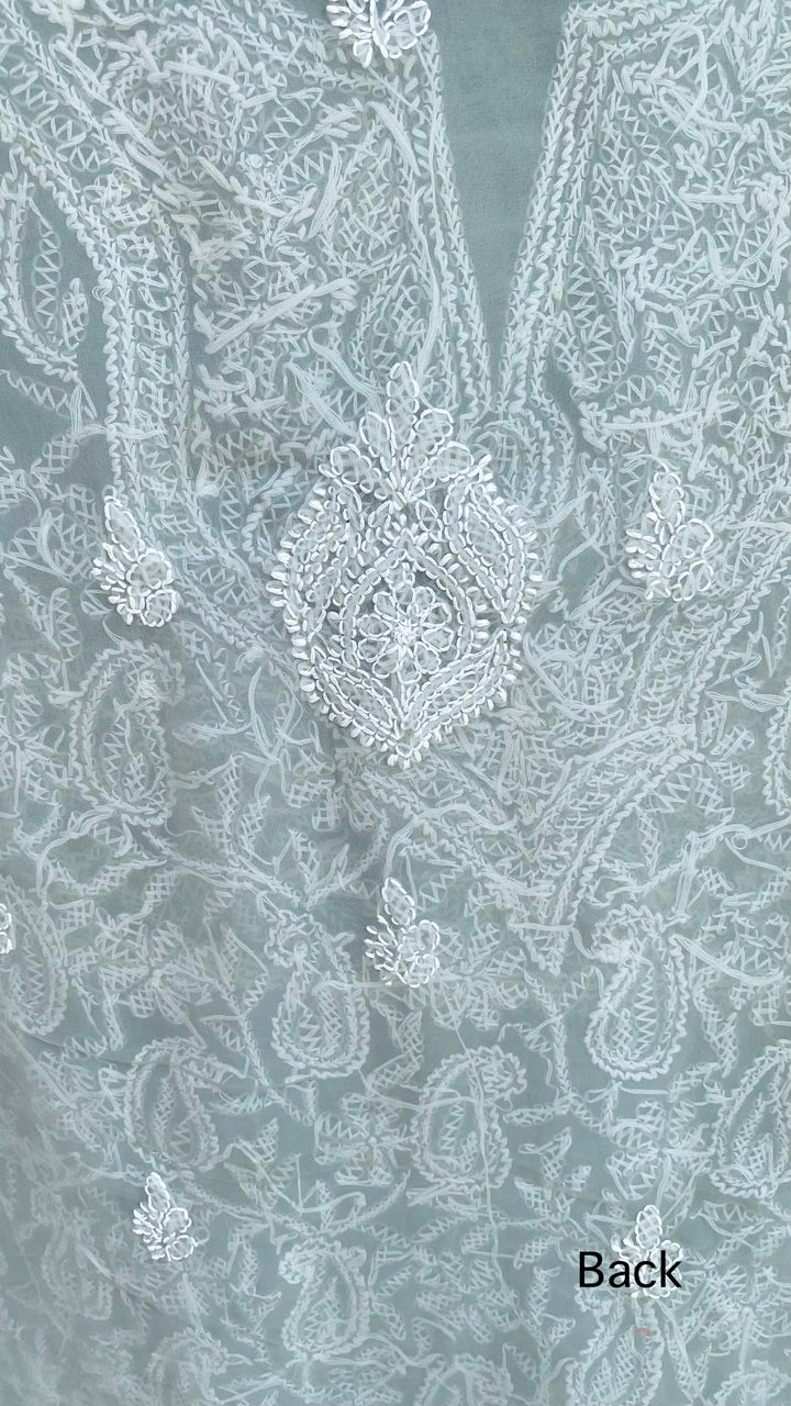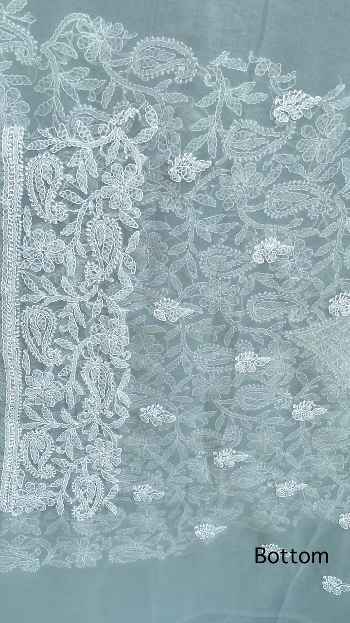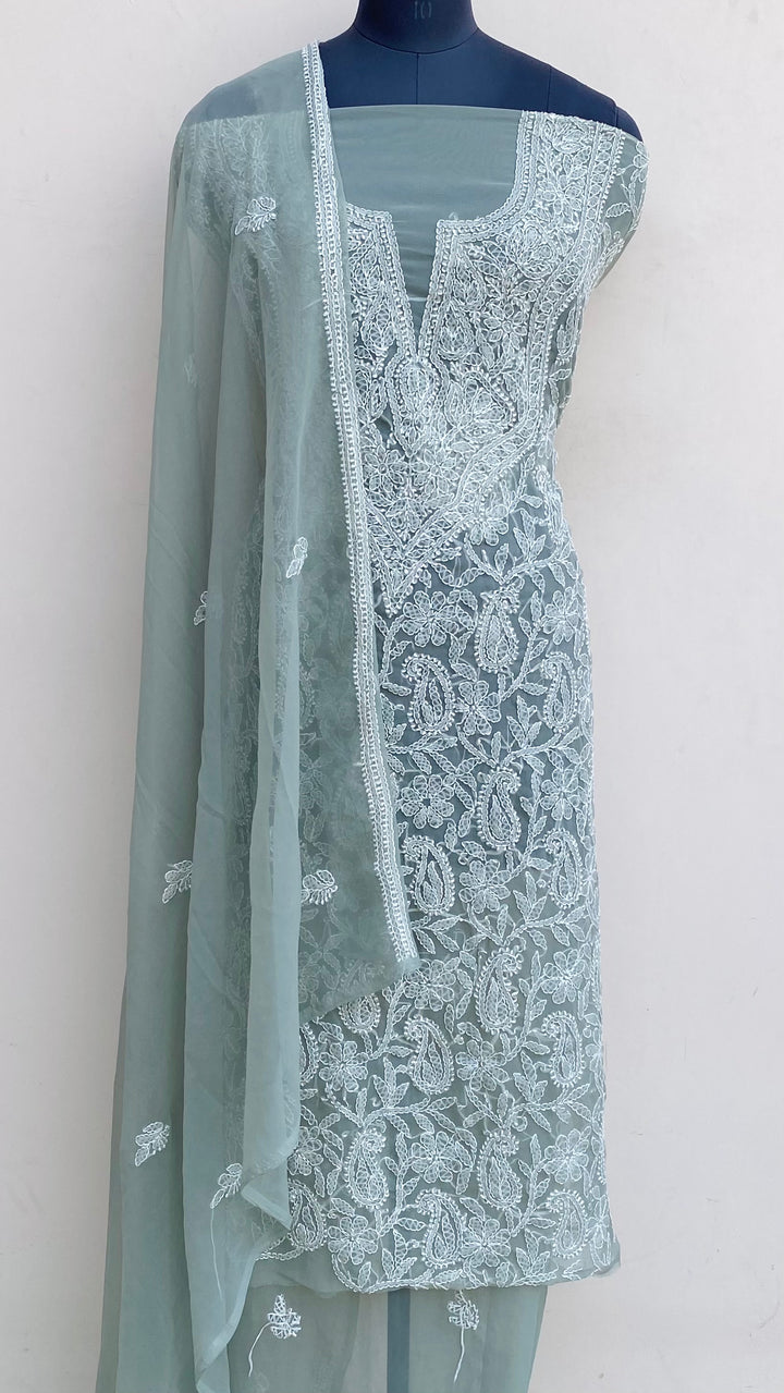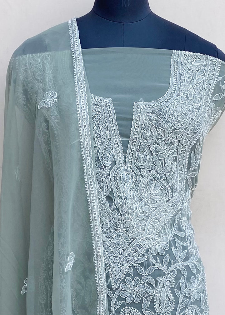 Lucknowi Chikankari Suit Length 3 Piece Gray Georgette With Embroidered Georgette Dupatta & Embroidered Same Colour Georgette Bottom