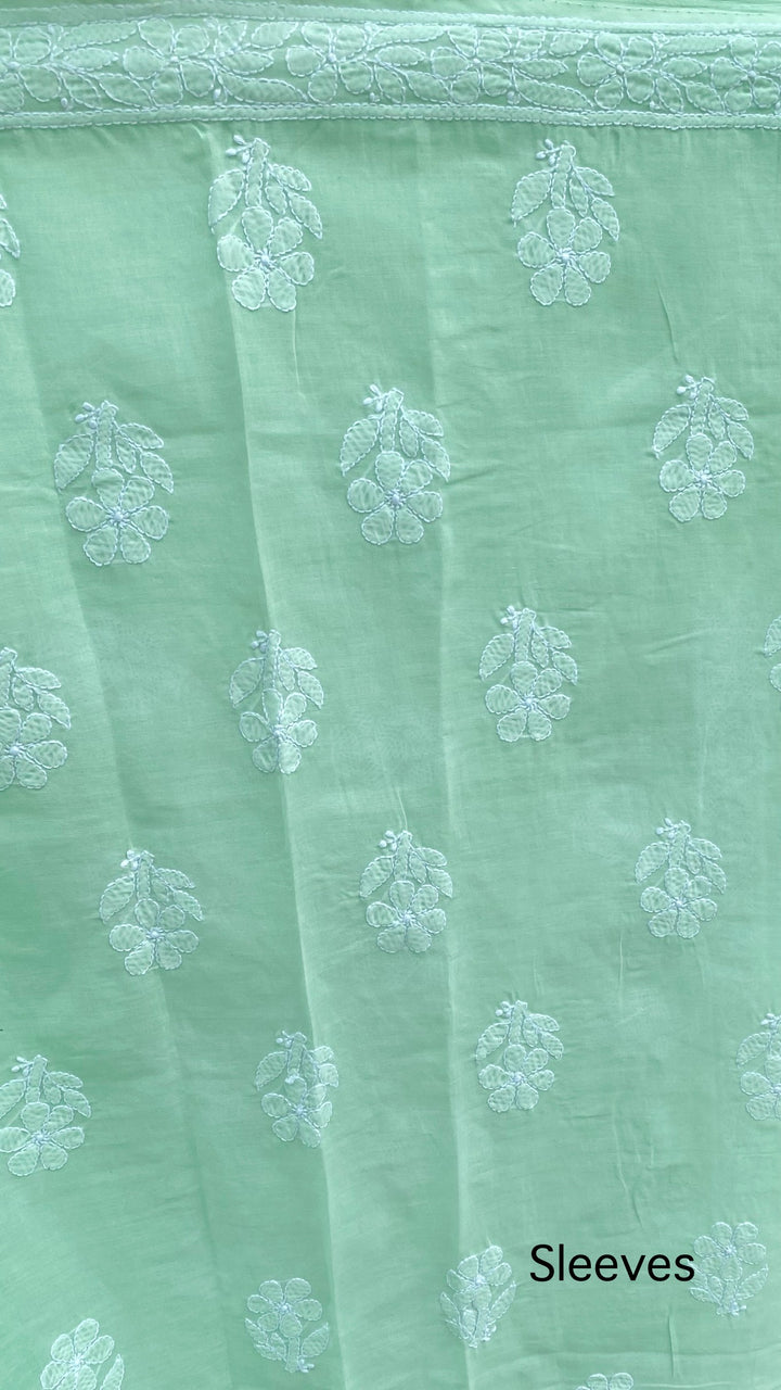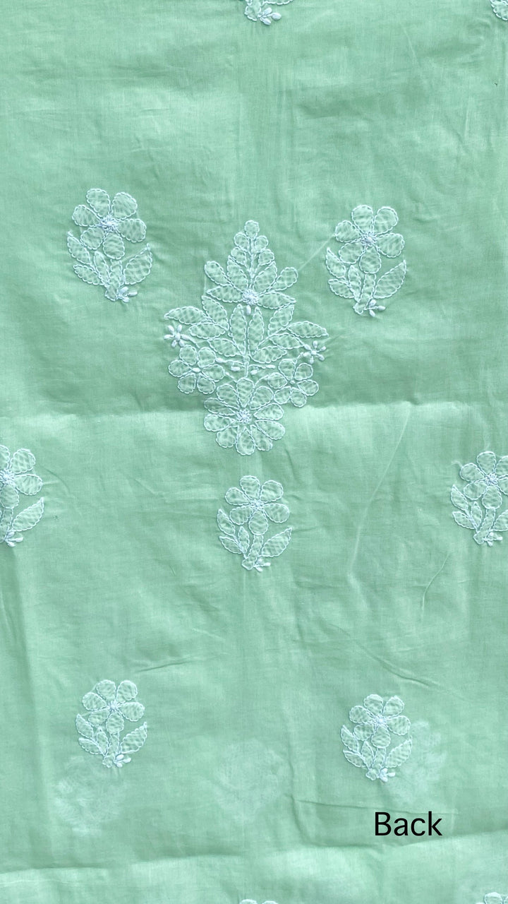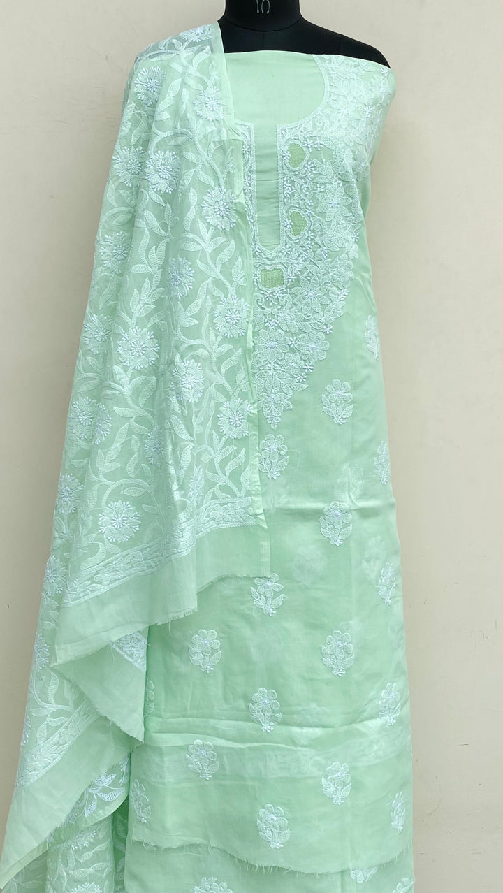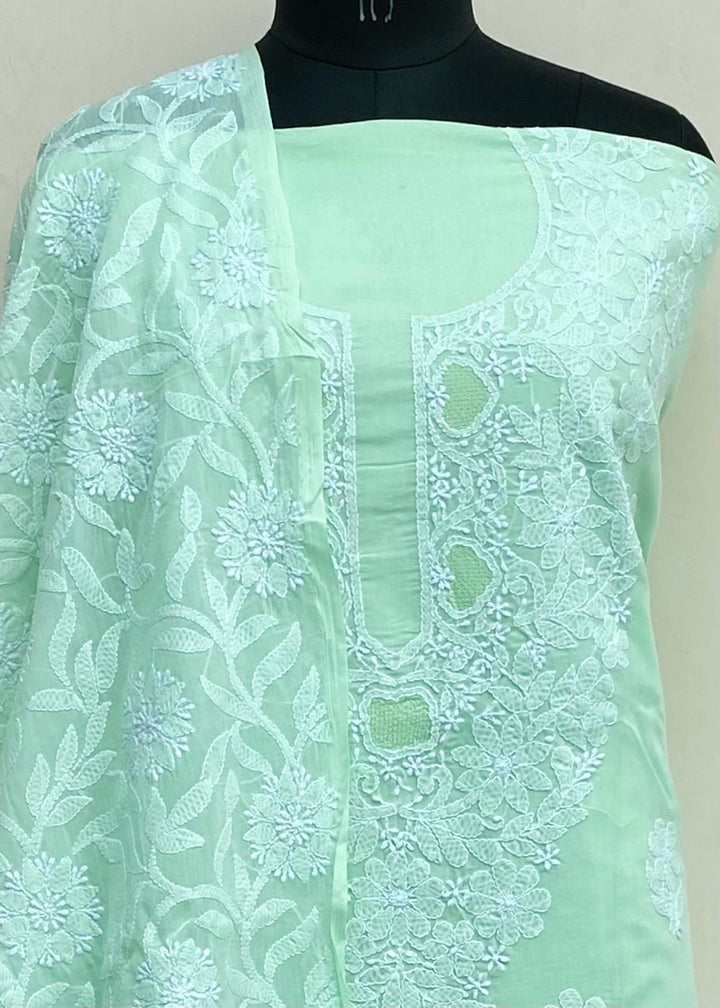 Lucknowi Chikankari Suit Length 3 Piece Green Cotton With Jaali Work With Embroidered Cotton Dupatta Dupatta & Embroidered Same Colour Cotton Bottom