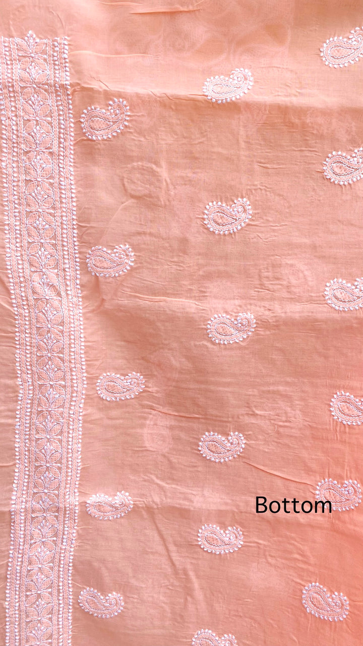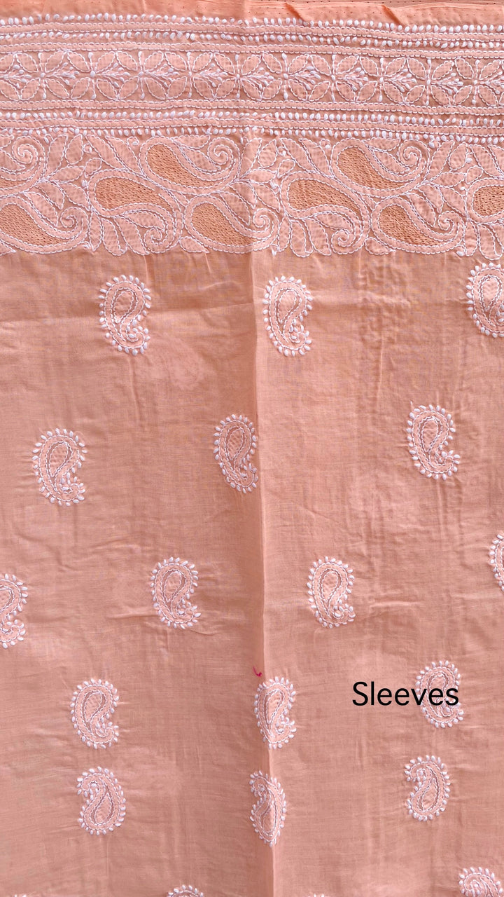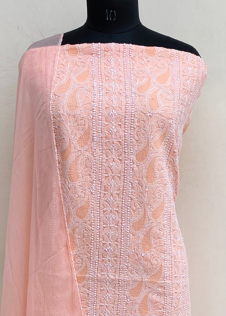 Lucknowi Chikankari Suit Length 3 Piece Peach Cotton With Jaali Work With Pure Chiffon Dupatta & Embroidered Same Colour Cotton Bottom