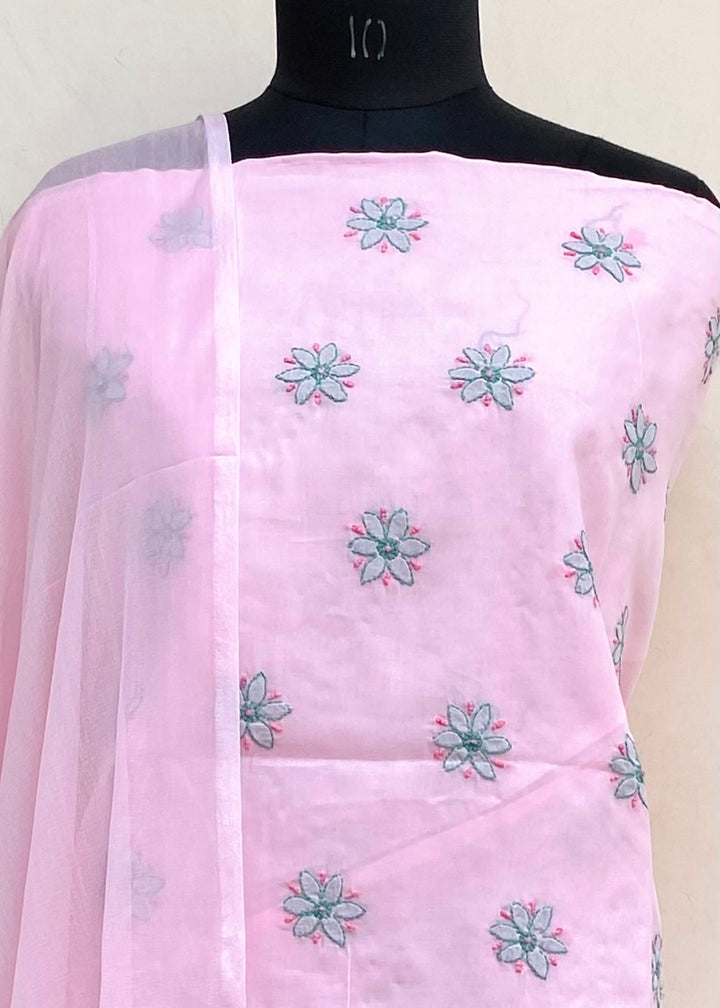 Lucknowi Chikankari Suit Length 3 Piece Pink Cotton With Pure Chiffon Dupatta & Embroidered Same Colour Cotton Bottom