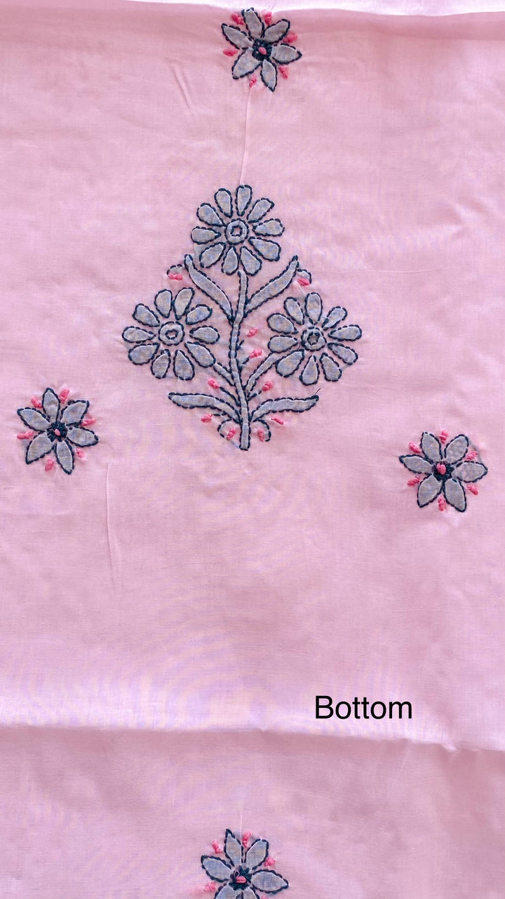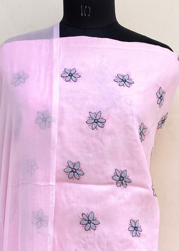 Lucknowi Chikankari Suit Length 3 Piece Pink Cotton With Pure Chiffon Dupatta & Embroidered Same Colour Cotton Bottom