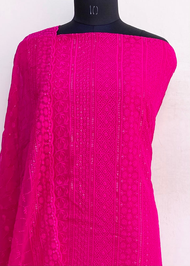 Lucknowi Chikankari Suit Length 3 Piece Pink Georgette With Embroidered Georgette Dupatta & Same Colour Santoon Bottom