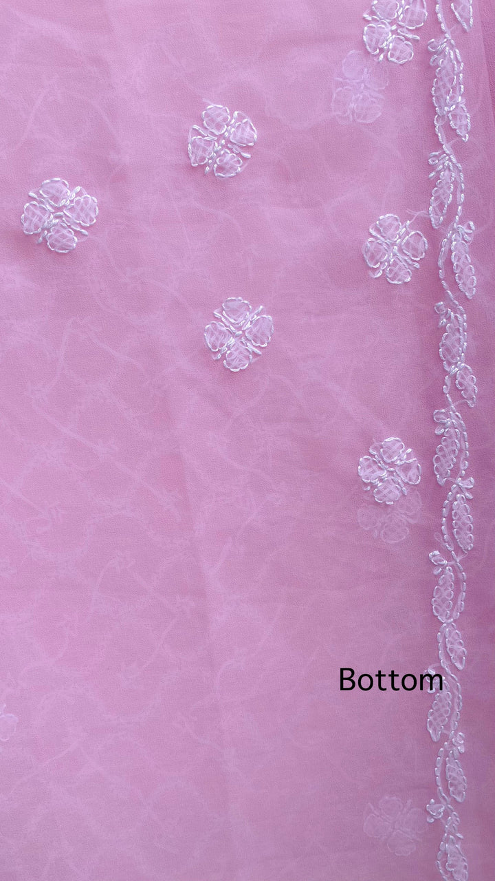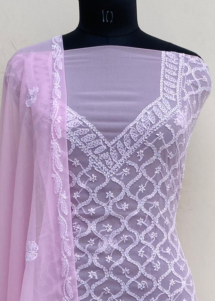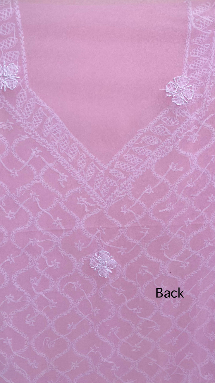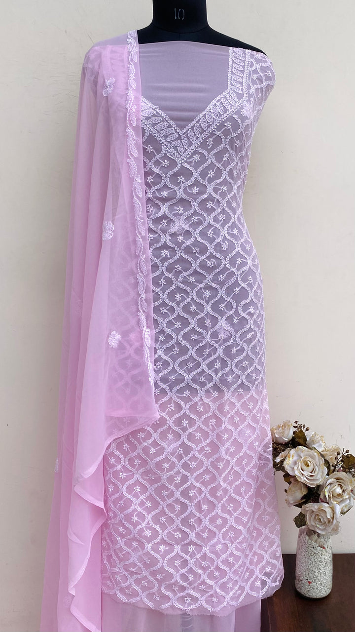 Lucknowi Chikankari Suit Length 3 Piece Pink Georgette With Embroidered Georgette Dupatta & Embroidered Same Colour Georgette Bottom