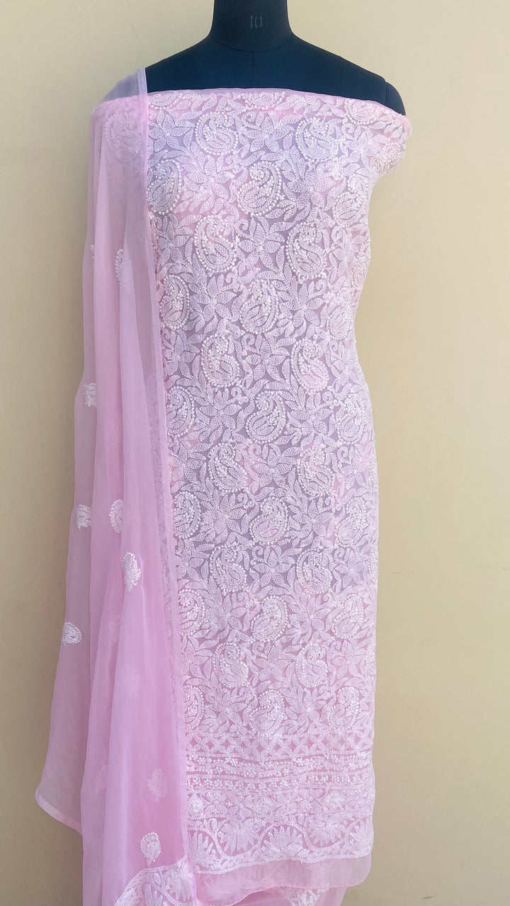 Lucknowi Chikankari Suit Length 3 Piece Pink Georgette With Embroidered Georgette Dupatta & Same Colour Embroidered Bottom