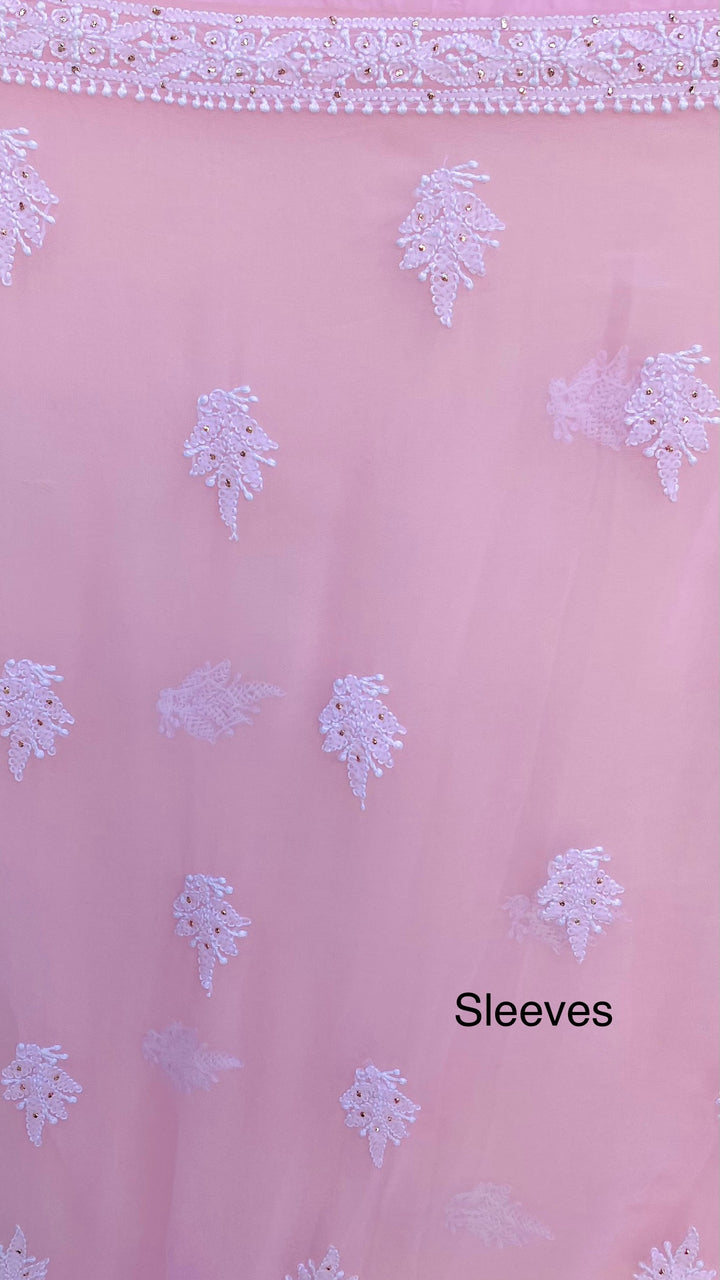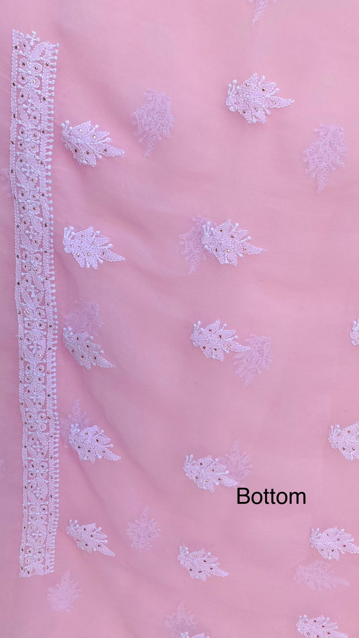 Lucknowi Chikankari Suit Length 3 Piece Pink Georgette With Mukaish Work With Embroidered Georgette Dupatta & Embroidered Same Colour Georgette Bottom