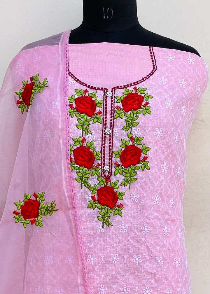 Designer Embroidered Suit Length 3 Piece Pink Kota With Embroidered Organza Dupatta & Same Colour Cotton Bottom