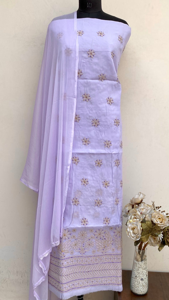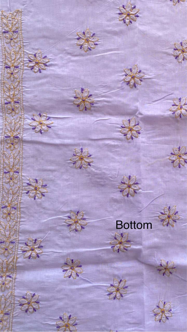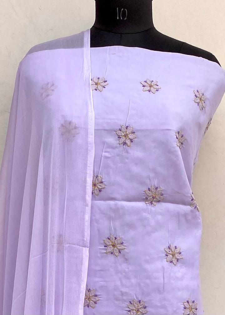Lucknowi Chikankari Suit Length 3 Piece Purple Cotton With Pure Chiffon Dupatta & Embroidered Same Colour Cotton Bottom
