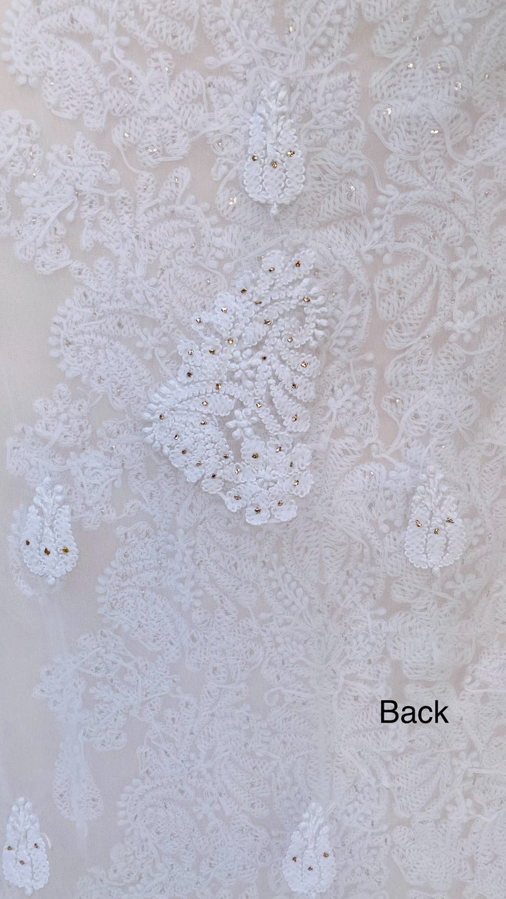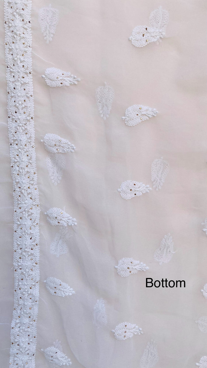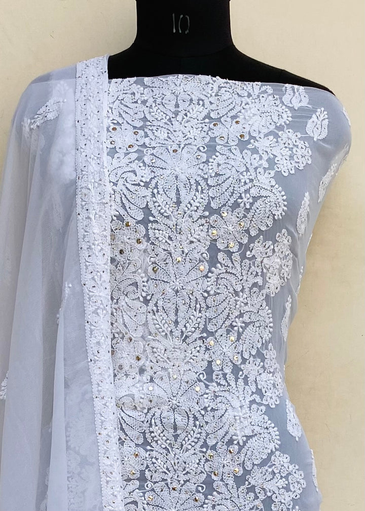 Lucknowi Chikankari Suit Length 3 Piece White Georgette With Mukaish Work With Embroidered Georgette Dupatta & Embroidered Same Colour Georgette Bottom