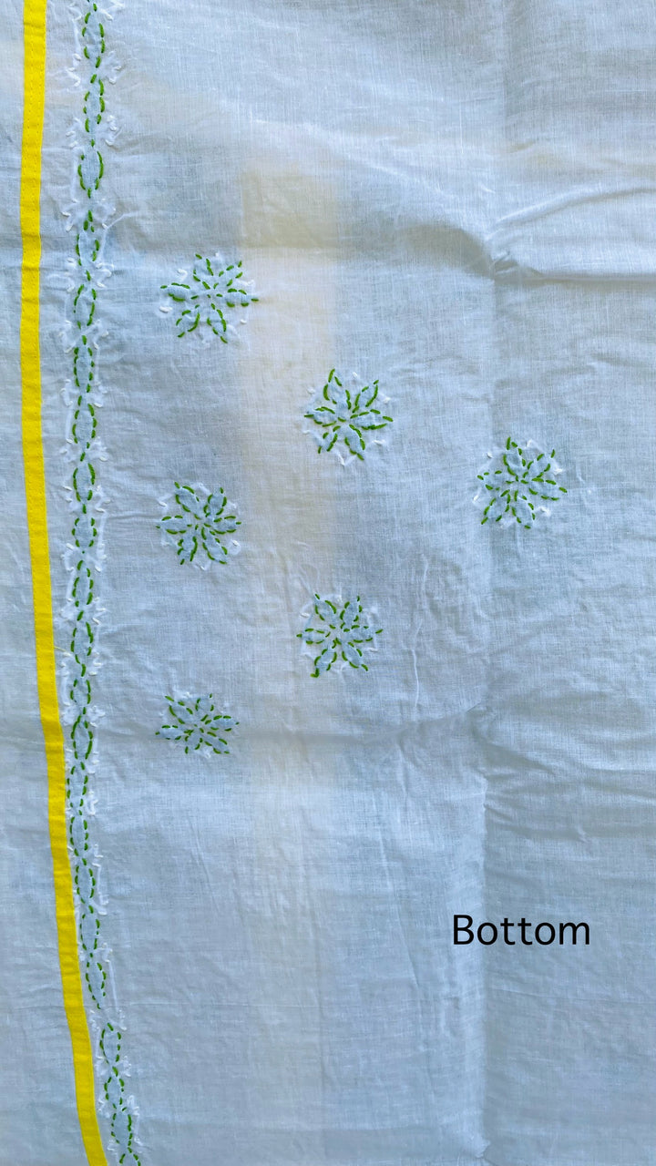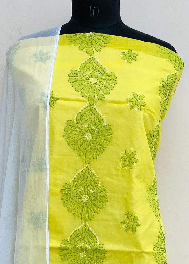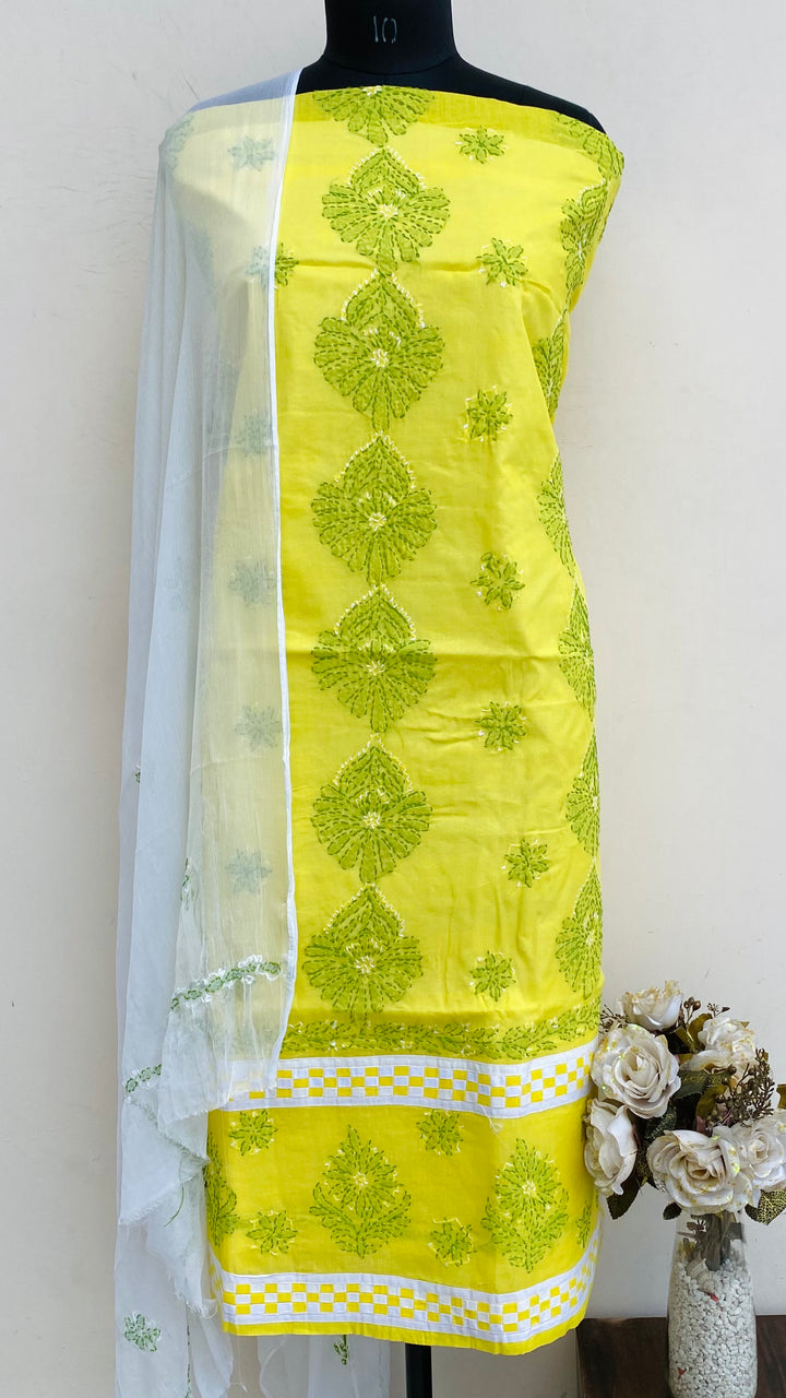 Lucknowi Chikankari Suit Length 3 Piece Yellow Cotton With Embroidered Chiffon Dupatta & Embroidered White Colour Cotton Bottom