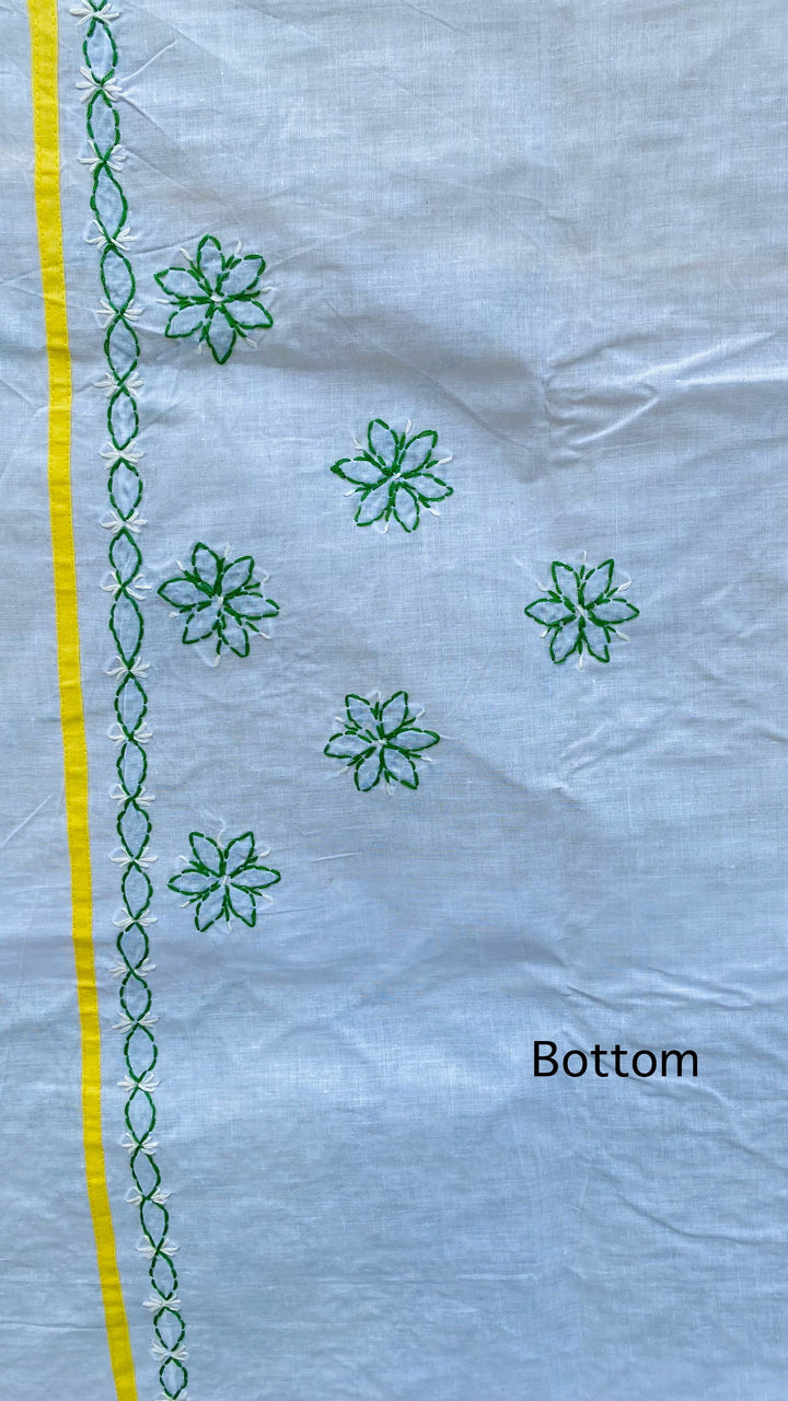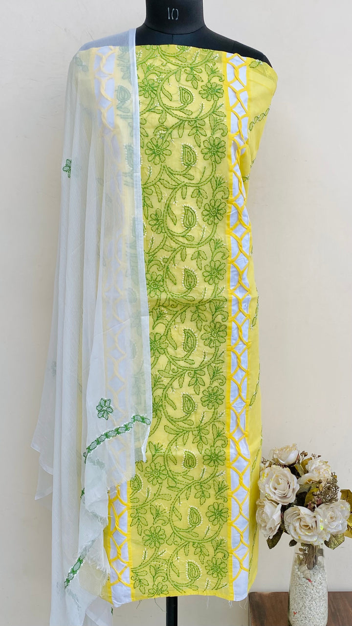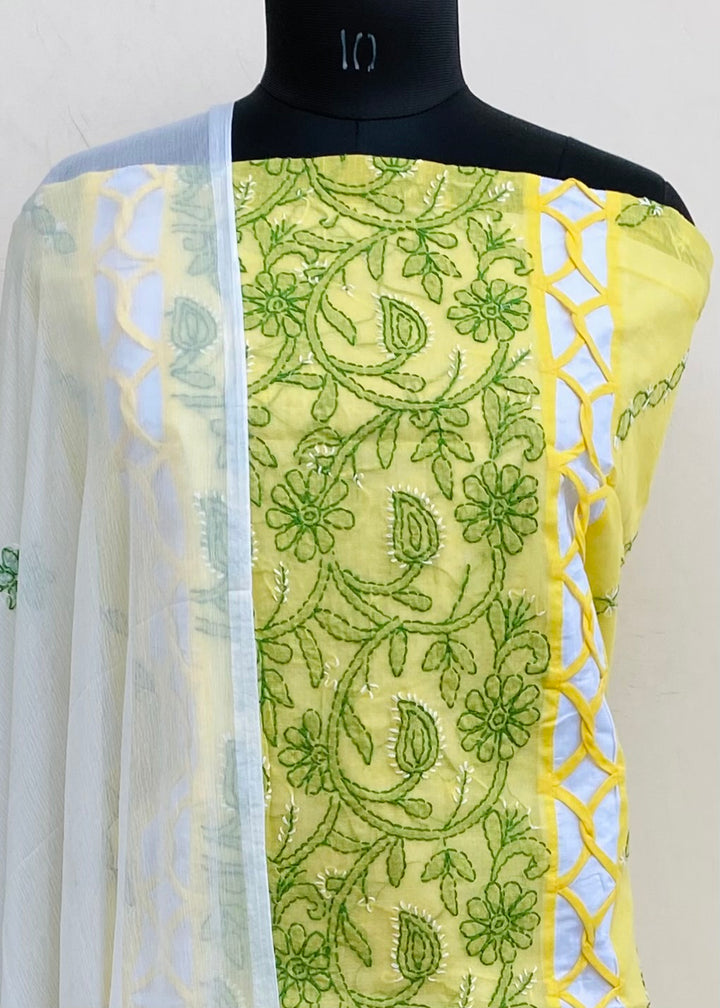 Lucknowi Chikankari Suit Length 3 Piece Yellow Cotton With Embroidered Chiffon Dupatta & Embroidered White Colour Cotton Bottom