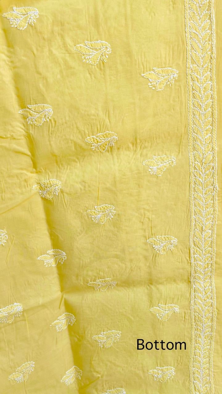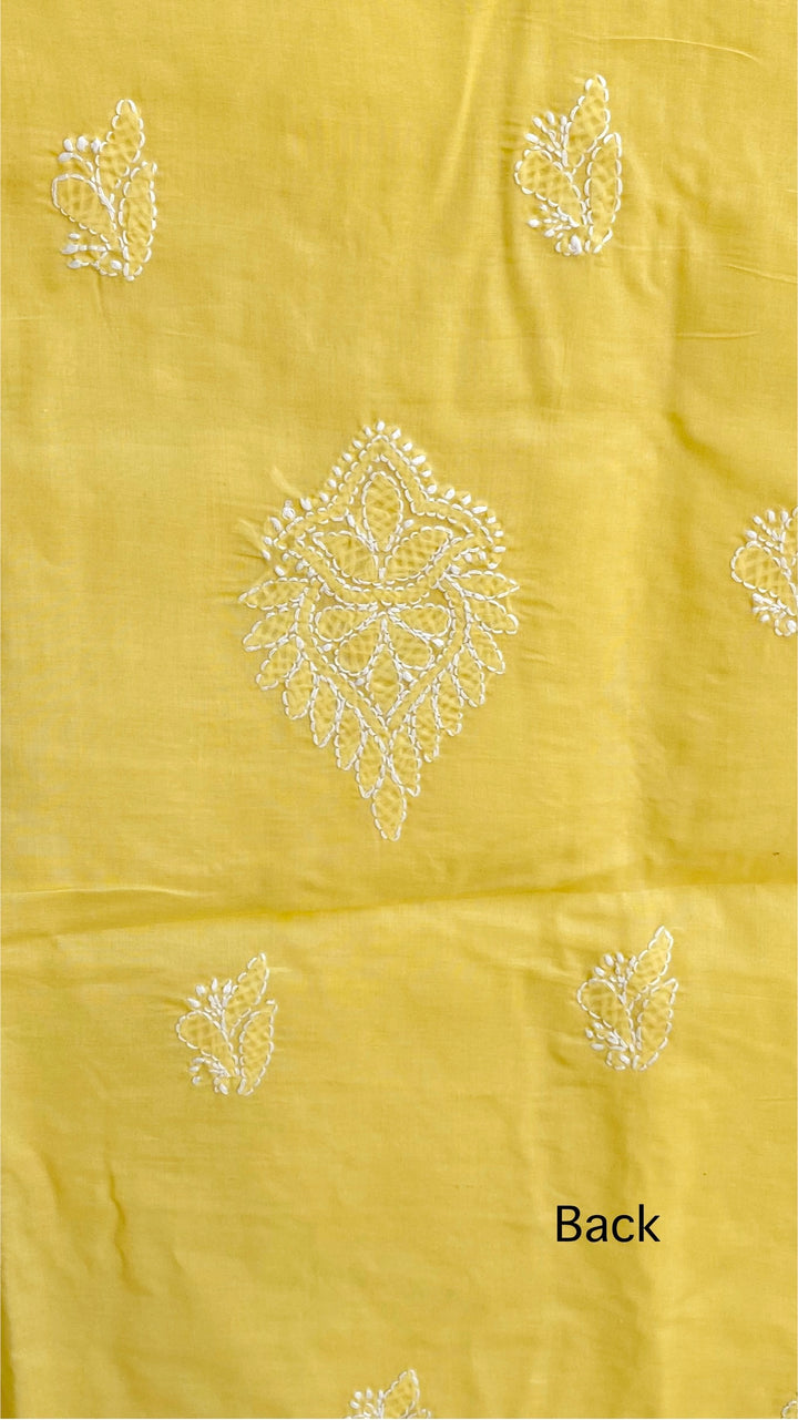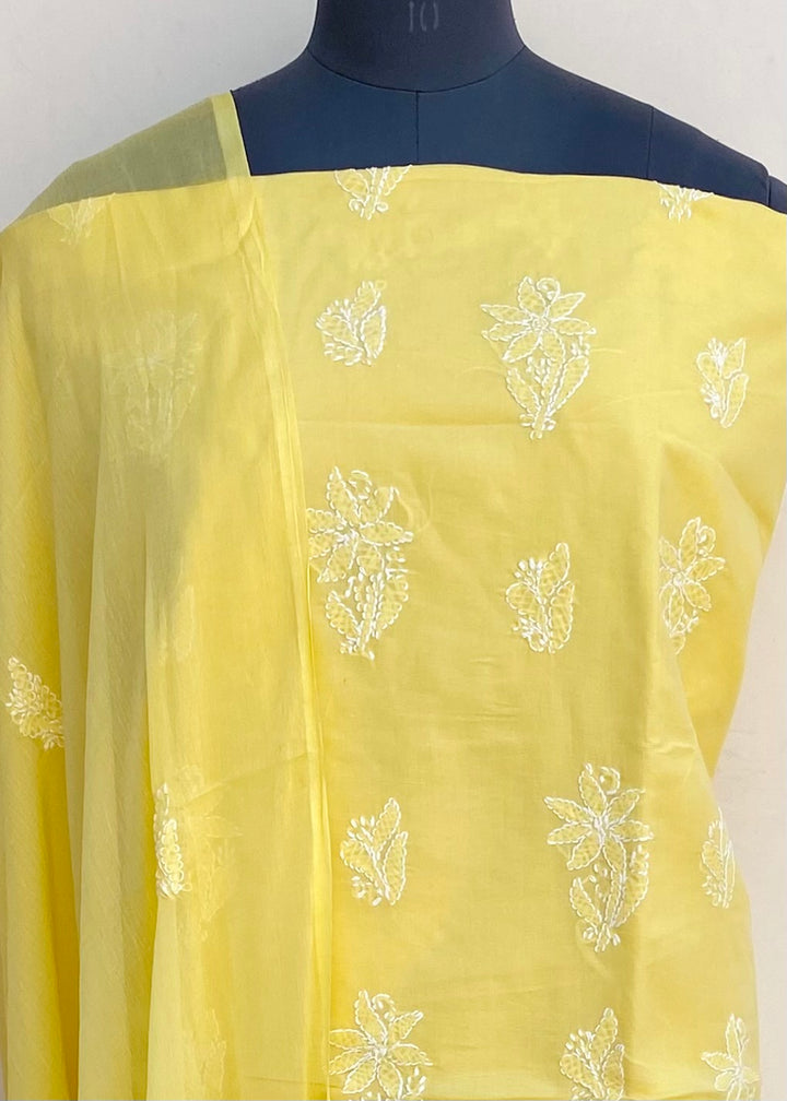 Lucknowi Chikankari Suit Length 3 Piece Yellow Cotton With Embroidered Chiffon Dupatta & Embroidered Same Colour Cotton Bottom