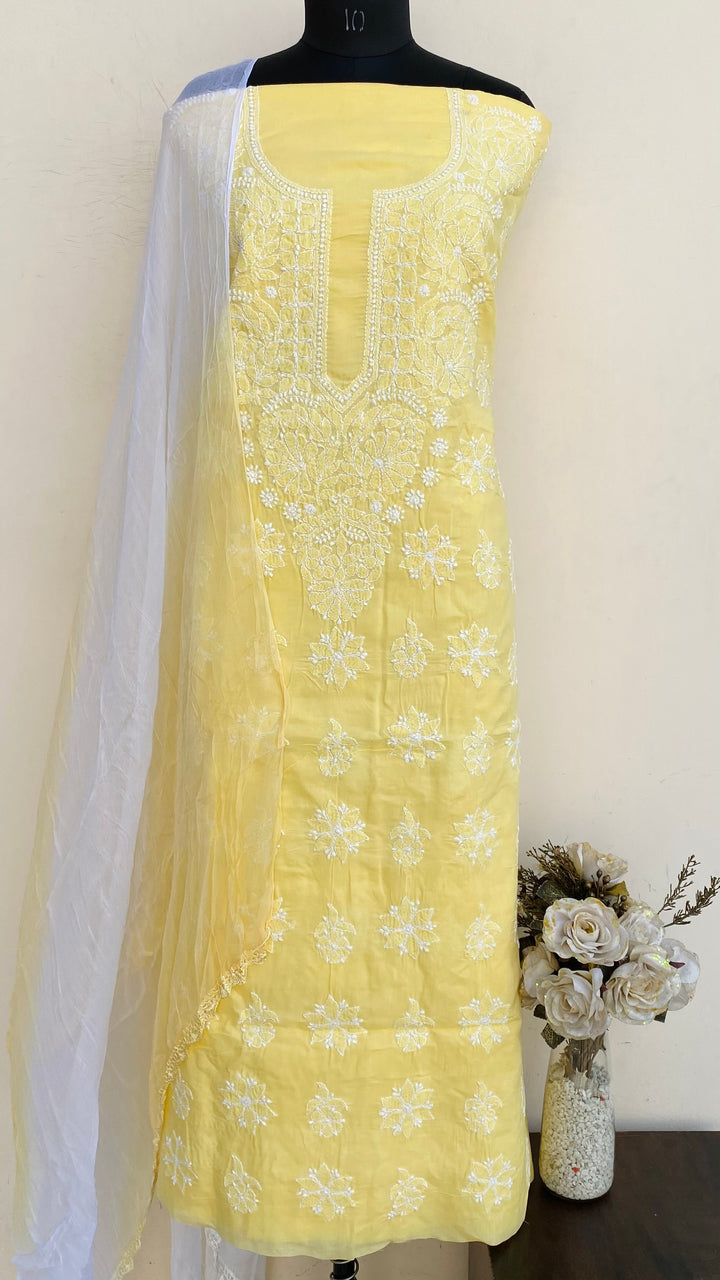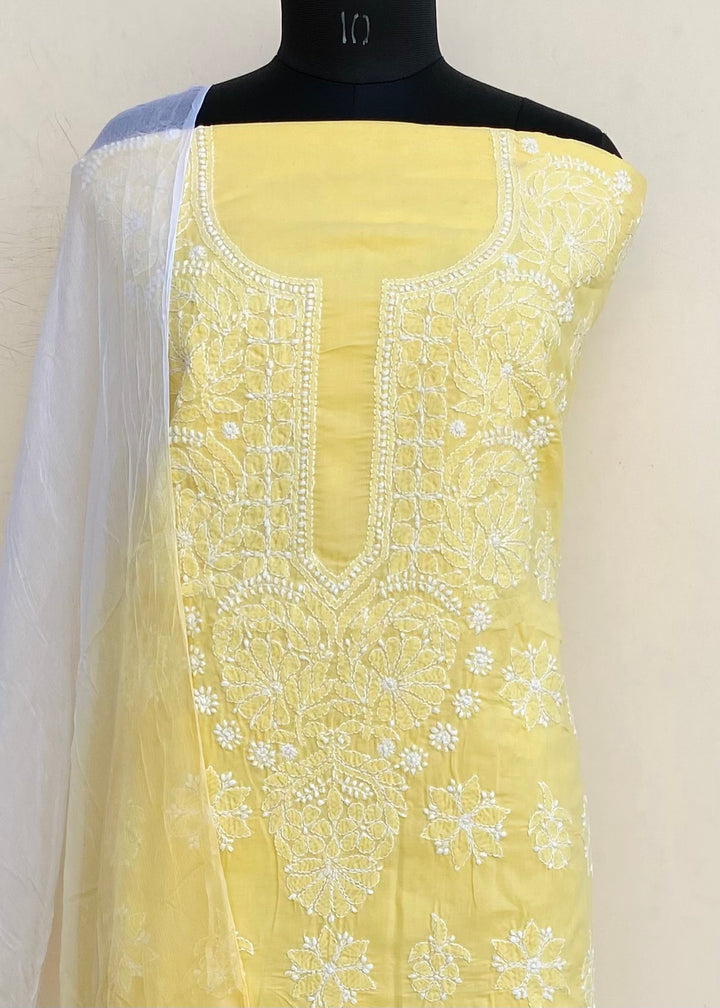 Lucknowi Chikankari Suit Length 3 Piece Yellow Cotton With Pure Chiffon Dupatta With Embroidered Same Colour Bottom