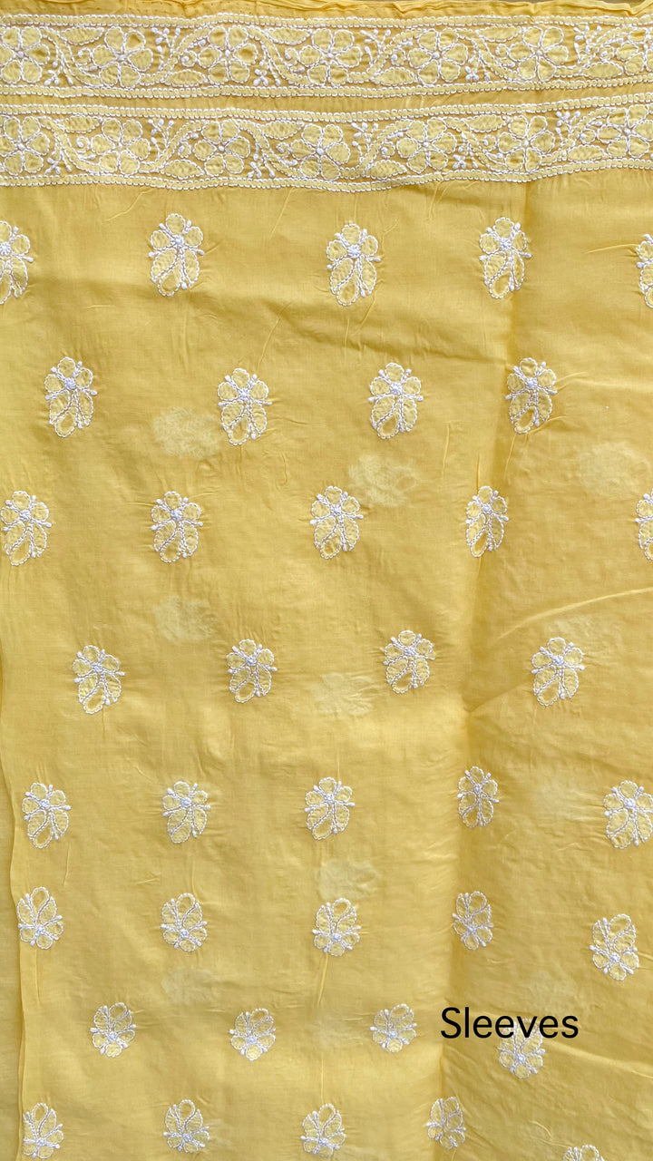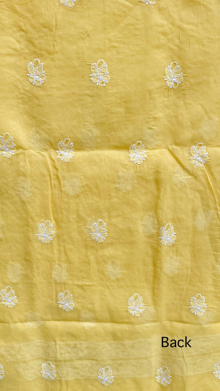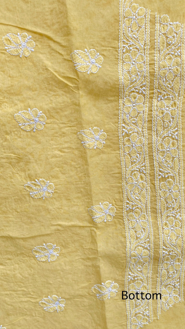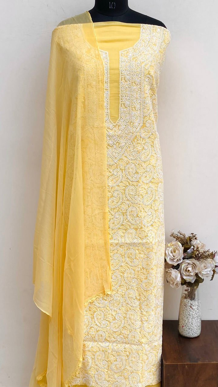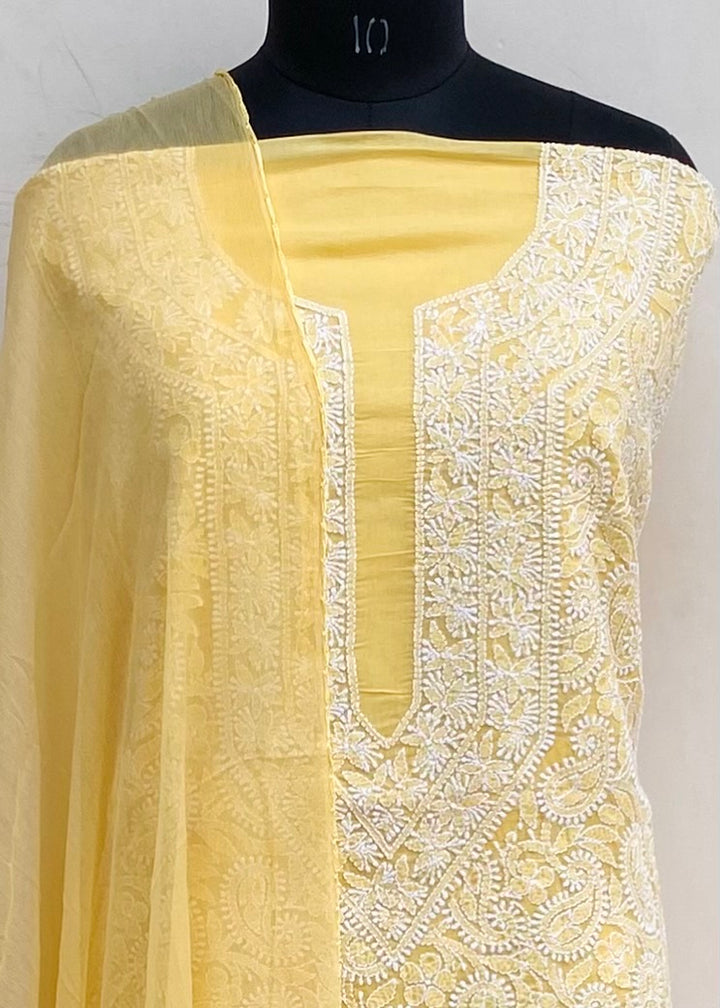 Lucknowi Chikankari Suit Length 3 Piece Yellow Cotton With Pure Chiffon Dupatta & Embroidered Same Colour Cotton Bottom