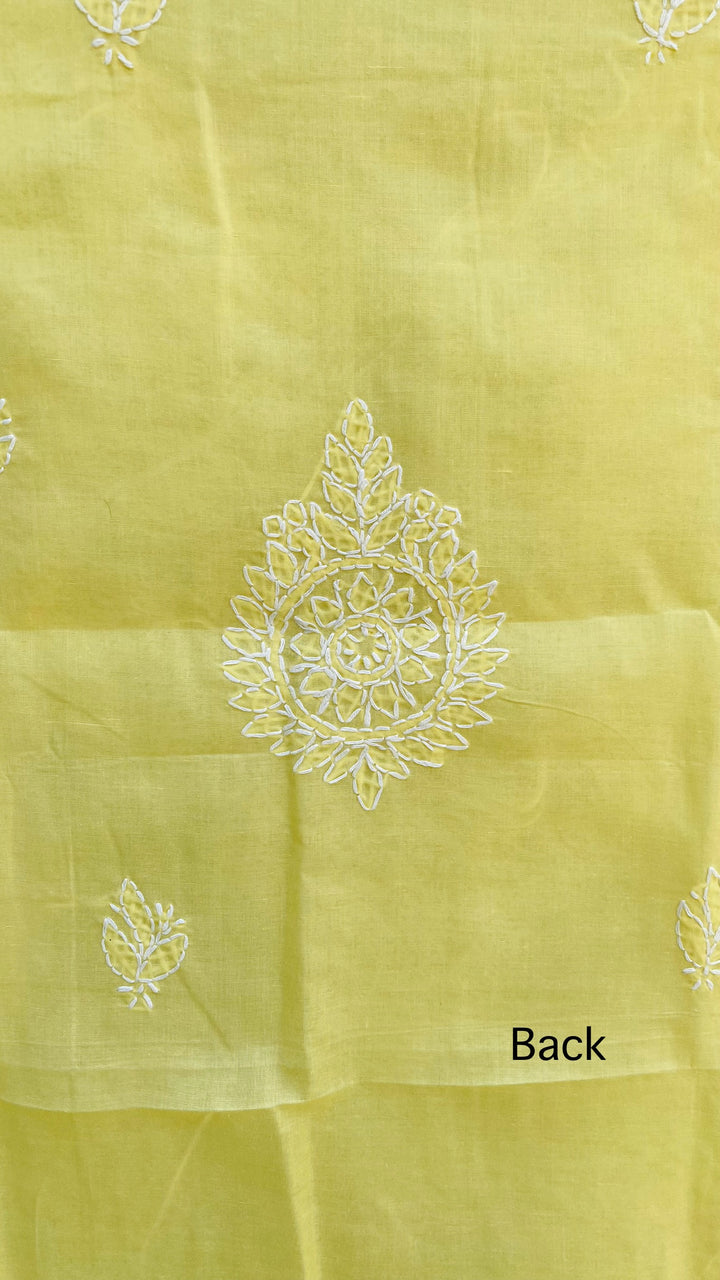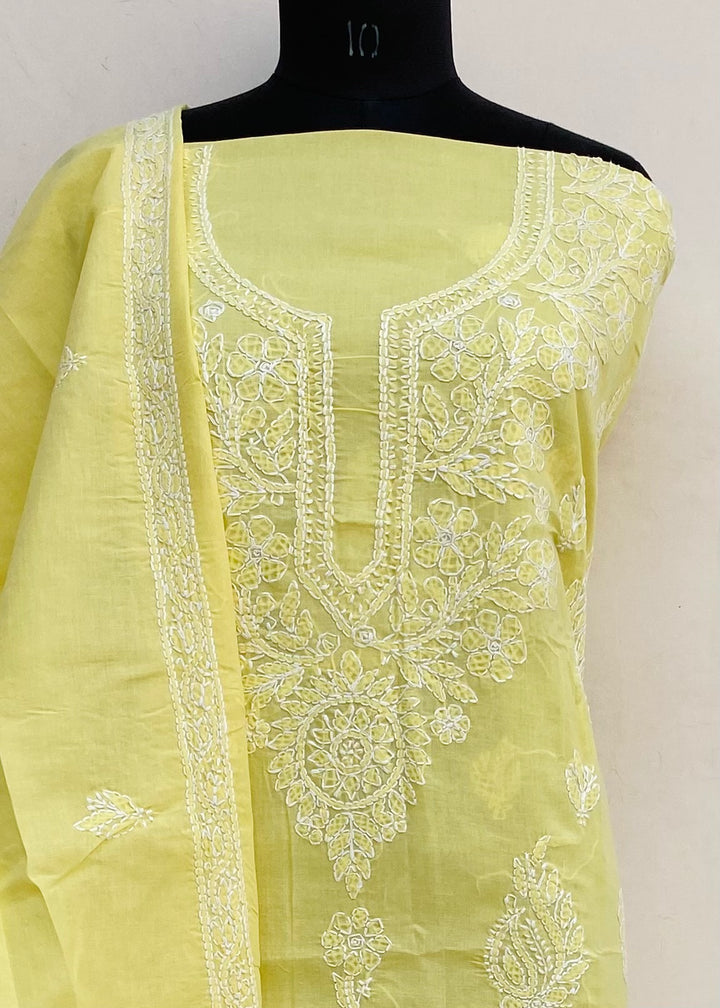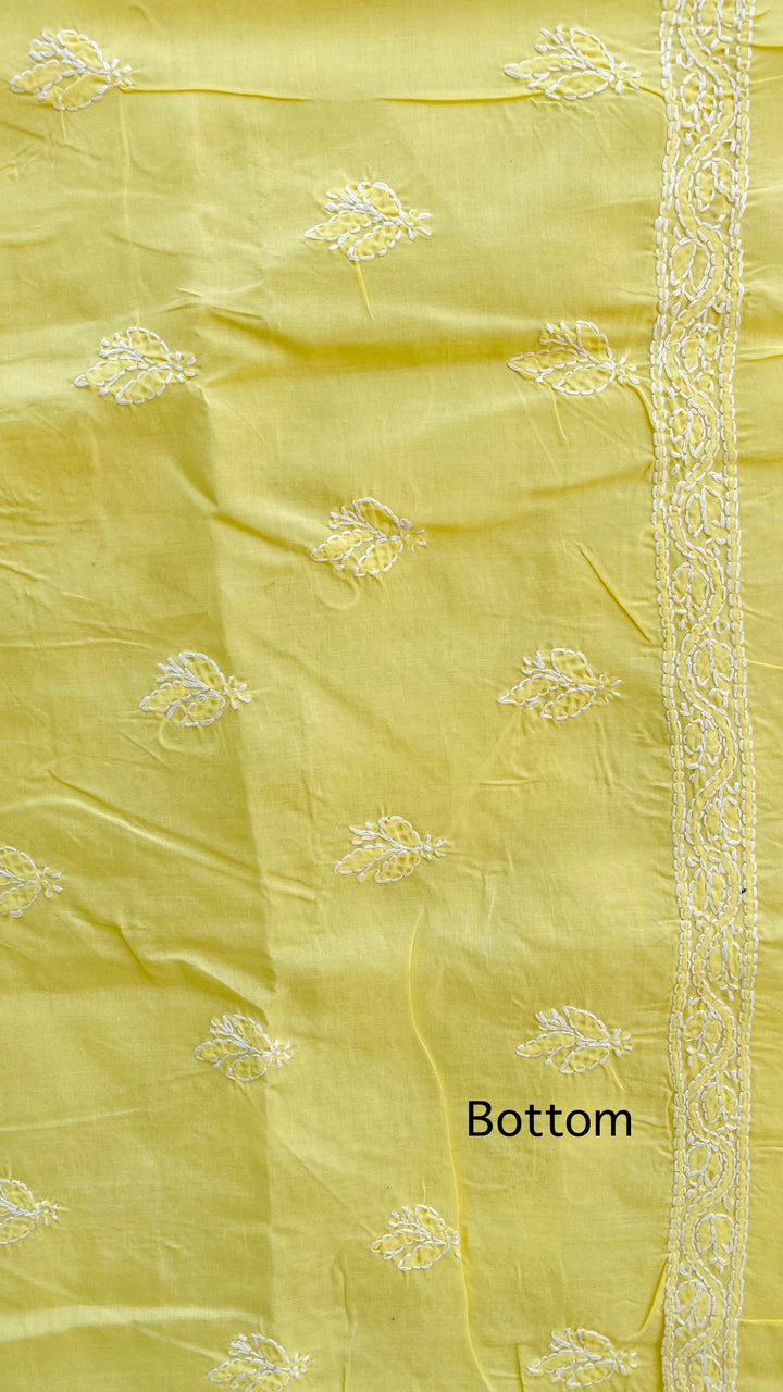 Lucknowi Chikankari Suit Length 3 Piece Yellow Cotton With Embroidered Cotton Dupatta & Embroidered Same Colour Cotton Bottom