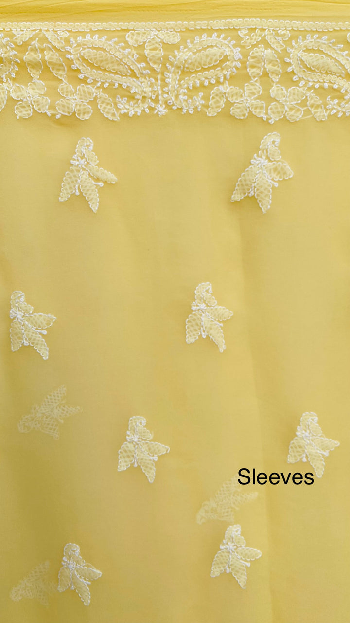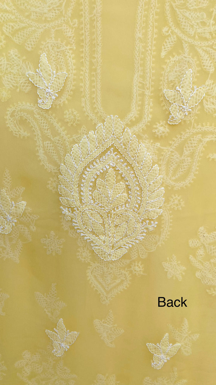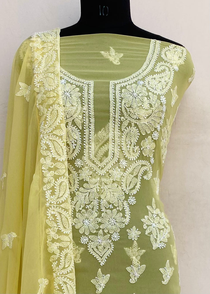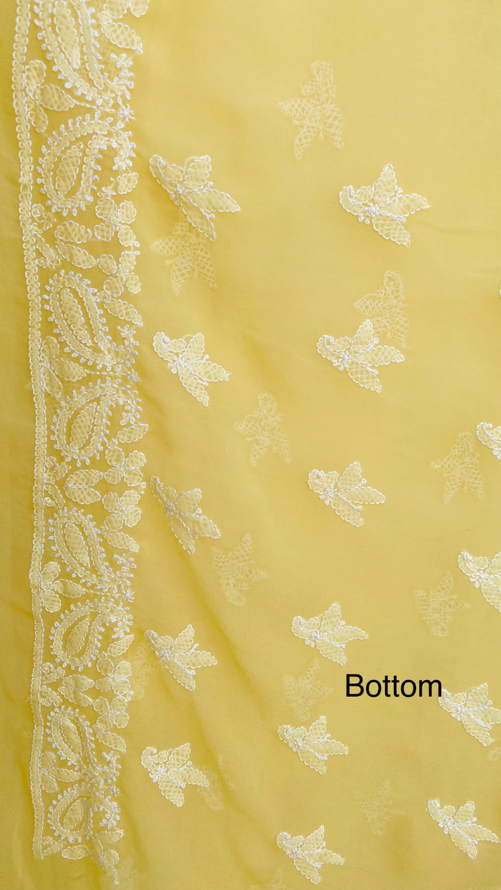 Lucknowi Chikankari Suit Length 3 Piece Yellow Georgette With Embroidered Georgette Dupatta & Embroidered Same Colour Georgette Bottom